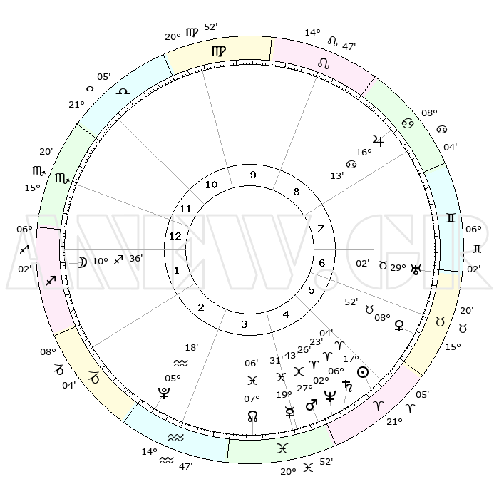 | | ΘΕΣΕΙΣ ΠΛΑΝΗΤΩΝ ΑΣΤΡΟΛΟΓΙΚΟΥ ΧΑΡΤΗ ΤΗΣ ΣΤΙΓΜΗΣ ΑΥΤΗΣ | | | | Πλανήτης | Ζώδιο | Μοίρες | Δεκαήμ. | Σε οίκο | Απόκλιση | | Ακμές των οίκων | | Ηλιος | Κριός | 17°00' | Δεύτερο | 5 | 06 N 41 | | 1ος | 16°11' | Σκορπιός | | Σελήνη | Τοξότης | 09°48' | Πρώτο | 1 | 27 S 01 | | 2ος | 15°46' | Τοξότης | | Ερμής | Ιχθείς | 19°26' | Δεύτερο | 4 | 06 S 04 | | 3ος | 19°24' | Αιγόκερως | | Αφροδίτη | Ταύρος | 08°47' | Πρώτο | 6 | 14 N 14 | | 4ος | 24°45' | Υδροχόος | | Αρης | Ιχθείς | 27°40' | Τρίτο | 5 | 01 S 52 | | 5ος | 27°06' | Ιχθείς | | Δίας | Καρκίνος | 16°12' | Δεύτερο | 8 | 22 N 49 | | 6ος | 23°60' | Κριός | | Κρόνος | Κριός | 06°23' | Πρώτο | 5 | 00 N 34 | | 7ος | 16°11' | Ταύρος | | Ουρανός | Ταύρος | 29°01' | Τρίτο | 7 | 19 N 46 | | 8ος | 15°46' | Δίδυμοι | | Ποσειδώνας | Κριός | 02°26' | Πρώτο | 5 | 00 S 14 | | 9ος | 19°24' | Καρκίνος | | Πλούτωνας | Υδροχόος | 05°18' | Πρώτο | 3 | 22 S 47 | | 10ος | 24°45' | Λέων | | Β. Δεσμός | Ιχθείς | 07°06' | Πρώτο | 4 | 08 S 54 | | 11ος | 27°06' | Παρθένος | | Ωροσκόπος | Σκορπιός | 16°11' | Δεύτερο | | | 12ος | 23°60' | Ζυγός | | Μεσουράνημα | Λέων | 24°45' | Τρίτο | | | |