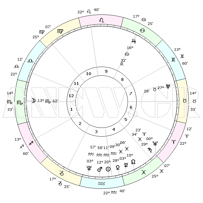 | | ΘΕΣΕΙΣ ΠΛΑΝΗΤΩΝ ΑΣΤΡΟΛΟΓΙΚΟΥ ΧΑΡΤΗ ΤΗΣ ΣΤΙΓΜΗΣ ΑΥΤΗΣ | | | | Πλανήτης | Ζώδιο | Μοίρες | Δεκαήμ. | Σε οίκο | Απόκλιση | | Ακμές των οίκων | | Ηλιος | Υδροχόος | 20°08' | Τρίτο | 4 | 14 S 46 | | 1ος | 27°01' | Ζυγός | | Σελήνη | Σκορπιός | 13°09' | Δεύτερο | 1 | 20 S 17 | | 2ος | 25°15' | Σκορπιός | | Ερμής | Ιχθείς | 03°24' | Πρώτο | 4 | 11 S 16 | | 3ος | 26°59' | Τοξότης | | Αφροδίτη | Υδροχόος | 28°05' | Τρίτο | 4 | 13 S 30 | | 4ος | 00°59' | Υδροχόος | | Αρης | Υδροχόος | 12°55' | Δεύτερο | 4 | 17 S 57 | | 5ος | 03°56' | Ιχθείς | | Δίας | Καρκίνος | 16°33'R | Δεύτερο | 9 | 22 N 43 | | 6ος | 02°51' | Κριός | | Κρόνος | Ιχθείς | 29°34' | Τρίτο | 5 | 02 S 09 | | 7ος | 27°01' | Κριός | | Ουρανός | Ταύρος | 27°28' | Τρίτο | 8 | 19 N 24 | | 8ος | 25°15' | Ταύρος | | Ποσειδώνας | Κριός | 00°22' | Πρώτο | 5 | 01 S 03 | | 9ος | 26°59' | Δίδυμοι | | Πλούτωνας | Υδροχόος | 03°57' | Πρώτο | 4 | 22 S 59 | | 10ος | 00°59' | Λέων | | Β. Δεσμός | Ιχθείς | 10°07' | Δεύτερο | 5 | 07 S 47 | | 11ος | 03°56' | Παρθένος | | Ωροσκόπος | Ζυγός | 27°01' | Τρίτο | | | 12ος | 02°51' | Ζυγός | | Μεσουράνημα | Λέων | 00°59' | Πρώτο | | | |