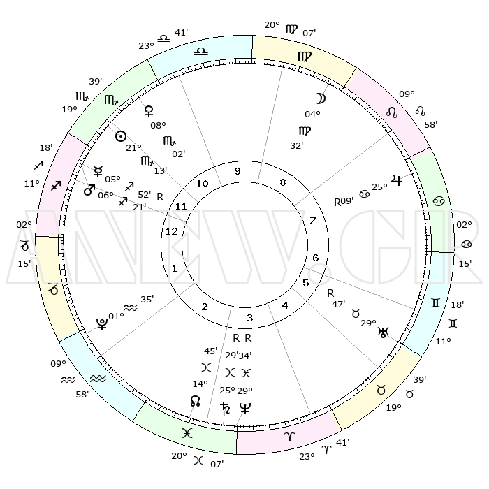 | | ΘΕΣΕΙΣ ΠΛΑΝΗΤΩΝ ΑΣΤΡΟΛΟΓΙΚΟΥ ΧΑΡΤΗ ΤΗΣ ΣΤΙΓΜΗΣ ΑΥΤΗΣ | | | | Πλανήτης | Ζώδιο | Μοίρες | Δεκαήμ. | Σε οίκο | Απόκλιση | | Ακμές των οίκων | | Ηλιος | Σκορπιός | 21°09' | Τρίτο | 11 | 18 S 02 | | 1ος | 12°52' | Τοξότης | | Σελήνη | Παρθένος | 03°45' | Πρώτο | 9 | 11 N 09 | | 2ος | 16°08' | Αιγόκερως | | Ερμής | Τοξότης | 05°54'R | Πρώτο | 12 | 22 S 56 | | 3ος | 23°59' | Υδροχόος | | Αφροδίτη | Σκορπιός | 07°58' | Πρώτο | 11 | 12 S 59 | | 4ος | 29°51' | Ιχθείς | | Αρης | Τοξότης | 06°19' | Πρώτο | 12 | 21 S 51 | | 5ος | 29°00' | Κριός | | Δίας | Καρκίνος | 25°09'R | Τρίτο | 8 | 21 N 13 | | 6ος | 22°24' | Ταύρος | | Κρόνος | Ιχθείς | 25°29'R | Τρίτο | 3 | 04 S 02 | | 7ος | 12°52' | Δίδυμοι | | Ουρανός | Ταύρος | 29°47'R | Τρίτο | 6 | 19 N 54 | | 8ος | 16°08' | Καρκίνος | | Ποσειδώνας | Ιχθείς | 29°34'R | Τρίτο | 3 | 01 S 25 | | 9ος | 23°59' | Λέων | | Πλούτωνας | Υδροχόος | 01°35' | Πρώτο | 2 | 23 S 29 | | 10ος | 29°51' | Παρθένος | | Β. Δεσμός | Ιχθείς | 14°45' | Δεύτερο | 3 | 06 S 00 | | 11ος | 29°00' | Ζυγός | | Ωροσκόπος | Τοξότης | 12°52' | Δεύτερο | | | 12ος | 22°24' | Σκορπιός | | Μεσουράνημα | Παρθένος | 29°51' | Τρίτο | | | |