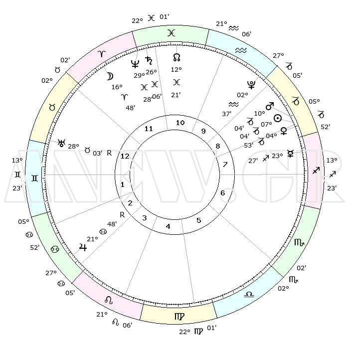 | | ΘΕΣΕΙΣ ΠΛΑΝΗΤΩΝ ΑΣΤΡΟΛΟΓΙΚΟΥ ΧΑΡΤΗ ΤΗΣ ΣΤΙΓΜΗΣ ΑΥΤΗΣ | | | | Πλανήτης | Ζώδιο | Μοίρες | Δεκαήμ. | Σε οίκο | Απόκλιση | | Ακμές των οίκων | | Ηλιος | Αιγόκερως | 06°59' | Πρώτο | 9 | 23 S 15 | | 1ος | 09°02' | Ταύρος | | Σελήνη | Κριός | 15°43' | Δεύτερο | 12 | 08 N 50 | | 2ος | 08°48' | Δίδυμοι | | Ερμής | Τοξότης | 23°20' | Τρίτο | 8 | 23 S 26 | | 3ος | 01°31' | Καρκίνος | | Αφροδίτη | Αιγόκερως | 04°48' | Πρώτο | 9 | 23 S 43 | | 4ος | 23°19' | Καρκίνος | | Αρης | Αιγόκερως | 10°00' | Δεύτερο | 9 | 23 S 55 | | 5ος | 18°42' | Λέων | | Δίας | Καρκίνος | 21°48'R | Τρίτο | 3 | 21 N 54 | | 6ος | 23°13' | Παρθένος | | Κρόνος | Ιχθείς | 26°05' | Τρίτο | 12 | 03 S 38 | | 7ος | 09°02' | Σκορπιός | | Ουρανός | Ταύρος | 28°03'R | Τρίτο | 1 | 19 N 31 | | 8ος | 08°48' | Τοξότης | | Ποσειδώνας | Ιχθείς | 29°28' | Τρίτο | 12 | 01 S 26 | | 9ος | 01°31' | Αιγόκερως | | Πλούτωνας | Υδροχόος | 02°37' | Πρώτο | 10 | 23 S 14 | | 10ος | 23°19' | Αιγόκερως | | Β. Δεσμός | Ιχθείς | 12°21' | Δεύτερο | 11 | 06 S 55 | | 11ος | 18°42' | Υδροχόος | | Ωροσκόπος | Ταύρος | 09°02' | Πρώτο | | | 12ος | 23°13' | Ιχθείς | | Μεσουράνημα | Αιγόκερως | 23°19' | Τρίτο | | | |