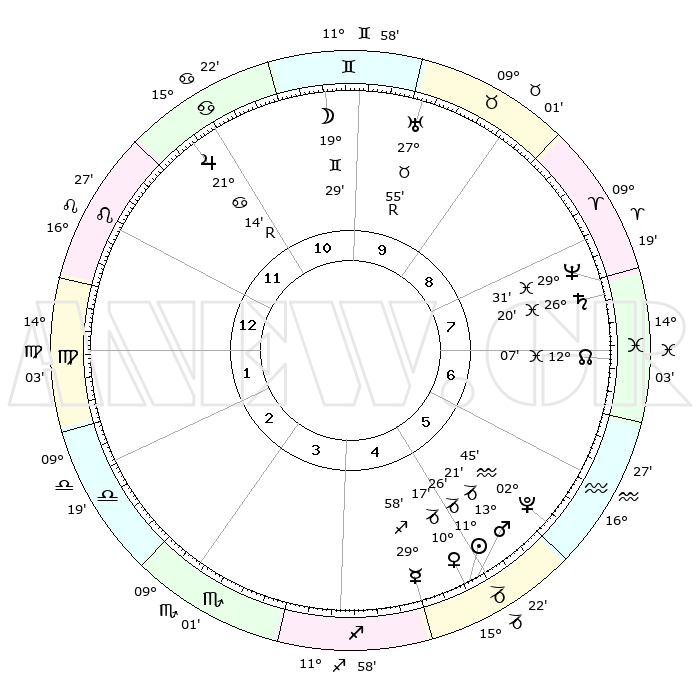 | | ΘΕΣΕΙΣ ΠΛΑΝΗΤΩΝ ΑΣΤΡΟΛΟΓΙΚΟΥ ΧΑΡΤΗ ΤΗΣ ΣΤΙΓΜΗΣ ΑΥΤΗΣ | | | | Πλανήτης | Ζώδιο | Μοίρες | Δεκαήμ. | Σε οίκο | Απόκλιση | | Ακμές των οίκων | | Ηλιος | Αιγόκερως | 11°22' | Δεύτερο | 5 | 22 S 57 | | 1ος | 23°23' | Λέων | | Σελήνη | Δίδυμοι | 18°25' | Δεύτερο | 10 | 27 N 56 | | 2ος | 16°33' | Παρθένος | | Ερμής | Τοξότης | 29°51' | Τρίτο | 5 | 24 S 05 | | 3ος | 14°34' | Ζυγός | | Αφροδίτη | Αιγόκερως | 10°12' | Δεύτερο | 5 | 23 S 34 | | 4ος | 17°21' | Σκορπιός | | Αρης | Αιγόκερως | 13°18' | Δεύτερο | 5 | 23 S 40 | | 5ος | 22°01' | Τοξότης | | Δίας | Καρκίνος | 21°15'R | Τρίτο | 11 | 22 N 00 | | 6ος | 24°33' | Αιγόκερως | | Κρόνος | Ιχθείς | 26°20' | Τρίτο | 8 | 03 S 32 | | 7ος | 23°23' | Υδροχόος | | Ουρανός | Ταύρος | 27°55'R | Τρίτο | 10 | 19 N 30 | | 8ος | 16°33' | Ιχθείς | | Ποσειδώνας | Ιχθείς | 29°31' | Τρίτο | 8 | 01 S 25 | | 9ος | 14°34' | Κριός | | Πλούτωνας | Υδροχόος | 02°45' | Πρώτο | 6 | 23 S 13 | | 10ος | 17°21' | Ταύρος | | Β. Δεσμός | Ιχθείς | 12°08' | Δεύτερο | 7 | 07 S 01 | | 11ος | 22°01' | Δίδυμοι | | Ωροσκόπος | Λέων | 23°23' | Τρίτο | | | 12ος | 24°33' | Καρκίνος | | Μεσουράνημα | Ταύρος | 17°21' | Δεύτερο | | | |