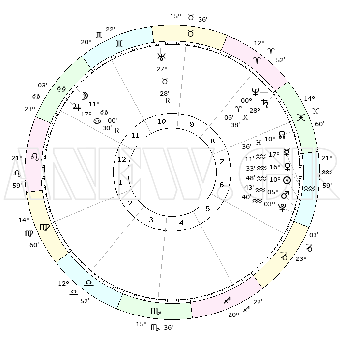 | | ΘΕΣΕΙΣ ΠΛΑΝΗΤΩΝ ΑΣΤΡΟΛΟΓΙΚΟΥ ΧΑΡΤΗ ΤΗΣ ΣΤΙΓΜΗΣ ΑΥΤΗΣ | | | | Πλανήτης | Ζώδιο | Μοίρες | Δεκαήμ. | Σε οίκο | Απόκλιση | | Ακμές των οίκων | | Ηλιος | Υδροχόος | 10°45' | Δεύτερο | 7 | 17 S 32 | | 1ος | 05°30' | Λέων | | Σελήνη | Καρκίνος | 10°11' | Δεύτερο | 12 | 27 N 30 | | 2ος | 26°56' | Λέων | | Ερμής | Υδροχόος | 17°05' | Δεύτερο | 7 | 17 S 34 | | 3ος | 22°44' | Παρθένος | | Αφροδίτη | Υδροχόος | 16°29' | Δεύτερο | 7 | 17 S 10 | | 4ος | 24°23' | Ζυγός | | Αρης | Υδροχόος | 05°40' | Πρώτο | 7 | 19 S 51 | | 5ος | 00°14' | Τοξότης | | Δίας | Καρκίνος | 17°31'R | Δεύτερο | 12 | 22 N 35 | | 6ος | 05°04' | Αιγόκερως | | Κρόνος | Ιχθείς | 28°37' | Τρίτο | 9 | 02 S 33 | | 7ος | 05°30' | Υδροχόος | | Ουρανός | Ταύρος | 27°28'R | Τρίτο | 10 | 19 N 24 | | 8ος | 26°56' | Υδροχόος | | Ποσειδώνας | Κριός | 00°06' | Πρώτο | 9 | 01 S 10 | | 9ος | 22°44' | Ιχθείς | | Πλούτωνας | Υδροχόος | 03°39' | Πρώτο | 6 | 23 S 02 | | 10ος | 24°23' | Κριός | | Β. Δεσμός | Ιχθείς | 10°36' | Δεύτερο | 8 | 07 S 35 | | 11ος | 00°14' | Δίδυμοι | | Ωροσκόπος | Λέων | 05°30' | Πρώτο | | | 12ος | 05°04' | Καρκίνος | | Μεσουράνημα | Κριός | 24°23' | Τρίτο | | | |