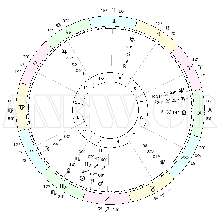 | | ΘΕΣΕΙΣ ΠΛΑΝΗΤΩΝ ΑΣΤΡΟΛΟΓΙΚΟΥ ΧΑΡΤΗ ΤΗΣ ΣΤΙΓΜΗΣ ΑΥΤΗΣ | | | | Πλανήτης | Ζώδιο | Μοίρες | Δεκαήμ. | Σε οίκο | Απόκλιση | | Ακμές των οίκων | | Ηλιος | Σκορπιός | 24°46' | Τρίτο | 4 | 18 S 57 | | 1ος | 17°59' | Λέων | | Σελήνη | Ζυγός | 17°49' | Δεύτερο | 3 | 09 S 27 | | 2ος | 10°35' | Παρθένος | | Ερμής | Τοξότης | 02°48'R | Πρώτο | 4 | 21 S 21 | | 3ος | 07°59' | Ζυγός | | Αφροδίτη | Σκορπιός | 12°28' | Δεύτερο | 4 | 14 S 28 | | 4ος | 10°34' | Σκορπιός | | Αρης | Τοξότης | 08°56' | Πρώτο | 4 | 22 S 19 | | 5ος | 15°38' | Τοξότης | | Δίας | Καρκίνος | 25°06'R | Τρίτο | 12 | 21 N 14 | | 6ος | 18°45' | Αιγόκερως | | Κρόνος | Ιχθείς | 25°24'R | Τρίτο | 8 | 04 S 03 | | 7ος | 17°59' | Υδροχόος | | Ουρανός | Ταύρος | 29°38'R | Τρίτο | 10 | 19 N 52 | | 8ος | 10°35' | Ιχθείς | | Ποσειδώνας | Ιχθείς | 29°32'R | Τρίτο | 8 | 01 S 26 | | 9ος | 07°59' | Κριός | | Πλούτωνας | Υδροχόος | 01°38' | Πρώτο | 6 | 23 S 28 | | 10ος | 10°34' | Ταύρος | | Β. Δεσμός | Ιχθείς | 14°33' | Δεύτερο | 8 | 06 S 05 | | 11ος | 15°38' | Δίδυμοι | | Ωροσκόπος | Λέων | 17°59' | Δεύτερο | | | 12ος | 18°45' | Καρκίνος | | Μεσουράνημα | Ταύρος | 10°34' | Δεύτερο | | | |