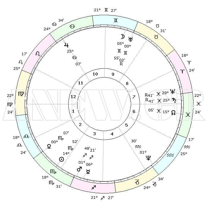 | | ΘΕΣΕΙΣ ΠΛΑΝΗΤΩΝ ΑΣΤΡΟΛΟΓΙΚΟΥ ΧΑΡΤΗ ΤΗΣ ΣΤΙΓΜΗΣ ΑΥΤΗΣ | | | | Πλανήτης | Ζώδιο | Μοίρες | Δεκαήμ. | Σε οίκο | Απόκλιση | | Ακμές των οίκων | | Ηλιος | Σκορπιός | 14°46' | Δεύτερο | 3 | 16 S 16 | | 1ος | 25°10' | Λέων | | Σελήνη | Δίδυμοι | 04°30' | Πρώτο | 10 | 25 N 54 | | 2ος | 18°31' | Παρθένος | | Ερμής | Τοξότης | 06°18' | Πρώτο | 4 | 24 S 00 | | 3ος | 16°43' | Ζυγός | | Αφροδίτη | Σκορπιός | 00°00' | Πρώτο | 3 | 10 S 10 | | 4ος | 19°33' | Σκορπιός | | Αρης | Τοξότης | 01°44' | Πρώτο | 4 | 20 S 57 | | 5ος | 24°05' | Τοξότης | | Δίας | Καρκίνος | 25°07' | Τρίτο | 11 | 21 N 12 | | 6ος | 26°27' | Αιγόκερως | | Κρόνος | Ιχθείς | 25°41'R | Τρίτο | 8 | 03 S 58 | | 7ος | 25°10' | Υδροχόος | | Ουρανός | Δίδυμοι | 00°02'R | Πρώτο | 10 | 19 N 57 | | 8ος | 18°31' | Ιχθείς | | Ποσειδώνας | Ιχθείς | 29°41'R | Τρίτο | 8 | 01 S 23 | | 9ος | 16°43' | Κριός | | Πλούτωνας | Υδροχόος | 01°30' | Πρώτο | 6 | 23 S 30 | | 10ος | 19°33' | Ταύρος | | Β. Δεσμός | Ιχθείς | 15°05' | Δεύτερο | 7 | 05 S 53 | | 11ος | 24°05' | Δίδυμοι | | Ωροσκόπος | Λέων | 25°10' | Τρίτο | | | 12ος | 26°27' | Καρκίνος | | Μεσουράνημα | Ταύρος | 19°33' | Δεύτερο | | | |