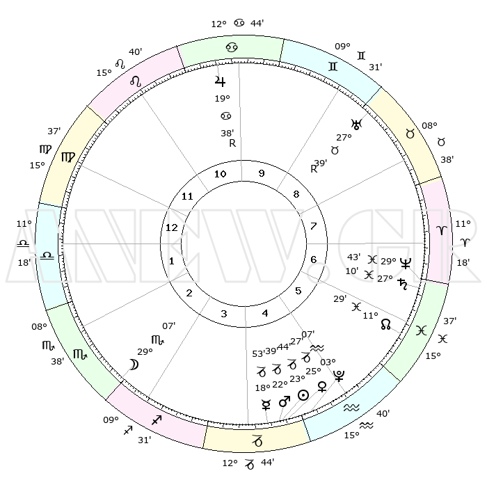 | | ΘΕΣΕΙΣ ΠΛΑΝΗΤΩΝ ΑΣΤΡΟΛΟΓΙΚΟΥ ΧΑΡΤΗ ΤΗΣ ΣΤΙΓΜΗΣ ΑΥΤΗΣ | | | | Πλανήτης | Ζώδιο | Μοίρες | Δεκαήμ. | Σε οίκο | Απόκλιση | | Ακμές των οίκων | | Ηλιος | Αιγόκερως | 23°38' | Τρίτο | 5 | 21 S 22 | | 1ος | 16°32' | Παρθένος | | Σελήνη | Σκορπιός | 28°07' | Τρίτο | 3 | 24 S 37 | | 2ος | 12°02' | Ζυγός | | Ερμής | Αιγόκερως | 18°45' | Δεύτερο | 5 | 23 S 49 | | 3ος | 11°52' | Σκορπιός | | Αφροδίτη | Αιγόκερως | 25°21' | Τρίτο | 5 | 21 S 59 | | 4ος | 14°48' | Τοξότης | | Αρης | Αιγόκερως | 22°35' | Τρίτο | 5 | 22 S 30 | | 5ος | 18°06' | Αιγόκερως | | Δίας | Καρκίνος | 19°38'R | Δεύτερο | 11 | 22 N 16 | | 6ος | 19°05' | Υδροχόος | | Κρόνος | Ιχθείς | 27°09' | Τρίτο | 7 | 03 S 10 | | 7ος | 16°32' | Ιχθείς | | Ουρανός | Ταύρος | 27°39'R | Τρίτο | 9 | 19 N 26 | | 8ος | 12°02' | Κριός | | Ποσειδώνας | Ιχθείς | 29°43' | Τρίτο | 7 | 01 S 20 | | 9ος | 11°52' | Ταύρος | | Πλούτωνας | Υδροχόος | 03°07' | Πρώτο | 5 | 23 S 08 | | 10ος | 14°48' | Δίδυμοι | | Β. Δεσμός | Ιχθείς | 11°29' | Δεύτερο | 6 | 07 S 15 | | 11ος | 18°06' | Καρκίνος | | Ωροσκόπος | Παρθένος | 16°32' | Δεύτερο | | | 12ος | 19°05' | Λέων | | Μεσουράνημα | Δίδυμοι | 14°48' | Δεύτερο | | | |