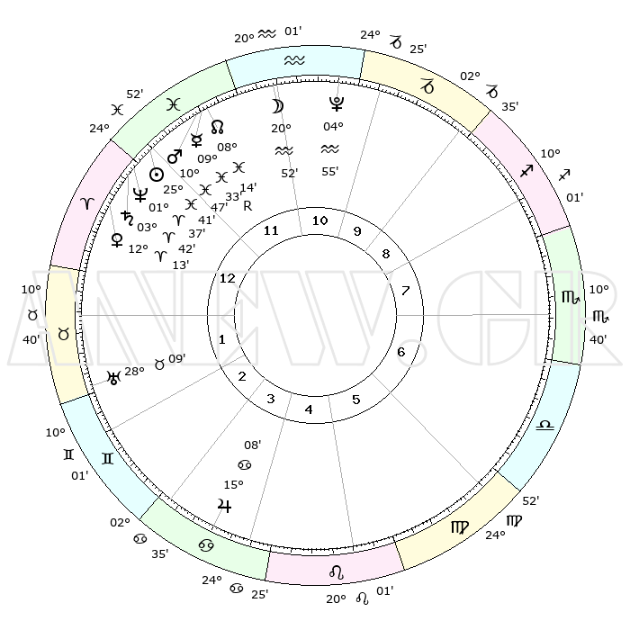 | | ΘΕΣΕΙΣ ΠΛΑΝΗΤΩΝ ΑΣΤΡΟΛΟΓΙΚΟΥ ΧΑΡΤΗ ΤΗΣ ΣΤΙΓΜΗΣ ΑΥΤΗΣ | | | | Πλανήτης | Ζώδιο | Μοίρες | Δεκαήμ. | Σε οίκο | Απόκλιση | | Ακμές των οίκων | | Ηλιος | Ιχθείς | 25°38' | Τρίτο | 12 | 01 S 44 | | 1ος | 06°09' | Κριός | | Σελήνη | Υδροχόος | 20°03' | Τρίτο | 11 | 16 S 25 | | 2ος | 14°54' | Ταύρος | | Ερμής | Ιχθείς | 09°35'R | Πρώτο | 12 | 06 S 00 | | 3ος | 11°24' | Δίδυμοι | | Αφροδίτη | Κριός | 12°08' | Δεύτερο | 1 | 03 N 52 | | 4ος | 03°27' | Καρκίνος | | Αρης | Ιχθείς | 10°44' | Δεύτερο | 12 | 08 S 33 | | 5ος | 26°04' | Καρκίνος | | Δίας | Καρκίνος | 15°08' | Δεύτερο | 4 | 22 N 56 | | 6ος | 24°27' | Λέων | | Κρόνος | Κριός | 03°42' | Πρώτο | 12 | 00 S 29 | | 7ος | 06°09' | Ζυγός | | Ουρανός | Ταύρος | 28°09' | Τρίτο | 2 | 19 N 34 | | 8ος | 14°54' | Σκορπιός | | Ποσειδώνας | Κριός | 01°37' | Πρώτο | 12 | 00 S 33 | | 9ος | 11°24' | Τοξότης | | Πλούτωνας | Υδροχόος | 04°55' | Πρώτο | 11 | 22 S 49 | | 10ος | 03°27' | Αιγόκερως | | Β. Δεσμός | Ιχθείς | 08°14' | Πρώτο | 12 | 08 S 29 | | 11ος | 26°04' | Αιγόκερως | | Ωροσκόπος | Κριός | 06°09' | Πρώτο | | | 12ος | 24°27' | Υδροχόος | | Μεσουράνημα | Αιγόκερως | 03°27' | Πρώτο | | | |