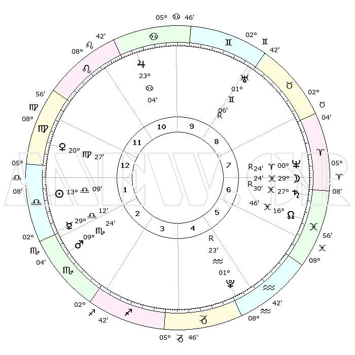 | ΘΕΣΕΙΣ ΠΛΑΝΗΤΩΝ ΑΣΤΡΟΛΟΓΙΚΟΥ ΧΑΡΤΗ ΤΗΣ ΣΤΙΓΜΗΣ ΑΥΤΗΣ | | Πλανήτης | Ζώδιο | Μοίρες | Δεκαήμ. | Σε οίκο | Απόκλιση | | Ακμές των οίκων | Ηλιος | Ζυγός | 13°04' | Δεύτερο | 2 | 05 S 09 | | 1ος | 07°32' | Παρθένος | Σελήνη | Ιχθείς | 28°02' | Τρίτο | 7 | 00 N 02 | | 2ος | 02°10' | Ζυγός | Ερμής | Ζυγός | 29°04' | Τρίτο | 2 | 11 S 48 | | 3ος | 01°27' | Σκορπιός | Αφροδίτη | Παρθένος | 20°20' | Τρίτο | 1 | 05 N 07 | | 4ος | 04°25' | Τοξότης | Αρης | Σκορπιός | 09°20' | Πρώτο | 3 | 14 S 44 | | 5ος | 08°08' | Αιγόκερως | Δίας | Καρκίνος | 23°03' | Τρίτο | 11 | 21 N 30 | | 6ος | 09°34' | Υδροχόος | Κρόνος | Ιχθείς | 27°31'R | Τρίτο | 7 | 03 S 18 | | 7ος | 07°32' | Ιχθείς | Ουρανός | Δίδυμοι | 01°06'R | Πρώτο | 9 | 20 N 10 | | 8ος | 02°10' | Κριός | Ποσειδώνας | Κριός | 00°25'R | Πρώτο | 7 | 01 S 06 | | 9ος | 01°27' | Ταύρος | Πλούτωνας | Υδροχόος | 01°23'R | Πρώτο | 5 | 23 S 32 | | 10ος | 04°25' | Δίδυμοι | Β. Δεσμός | Ιχθείς | 16°46' | Δεύτερο | 7 | 05 S 13 | | 11ος | 08°08' | Καρκίνος | Ωροσκόπος | Παρθένος | 07°32' | Πρώτο | | | 12ος | 09°34' | Λέων | Μεσουράνημα | Δίδυμοι | 04°25' | Πρώτο | | | |