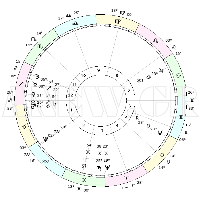 | | ΘΕΣΕΙΣ ΠΛΑΝΗΤΩΝ ΑΣΤΡΟΛΟΓΙΚΟΥ ΧΑΡΤΗ ΤΗΣ ΣΤΙΓΜΗΣ ΑΥΤΗΣ | | | | Πλανήτης | Ζώδιο | Μοίρες | Δεκαήμ. | Σε οίκο | Απόκλιση | | Ακμές των οίκων | | Ηλιος | Τοξότης | 25°21' | Τρίτο | 2 | 23 S 21 | | 1ος | 03°25' | Σκορπιός | | Σελήνη | Σκορπιός | 22°29' | Τρίτο | 1 | 22 S 56 | | 2ος | 02°03' | Τοξότης | | Ερμής | Τοξότης | 06°44' | Πρώτο | 2 | 20 S 10 | | 3ος | 04°17' | Αιγόκερως | | Αφροδίτη | Τοξότης | 20°25' | Τρίτο | 2 | 23 S 00 | | 4ος | 08°43' | Υδροχόος | | Αρης | Αιγόκερως | 01°20' | Πρώτο | 2 | 24 S 13 | | 5ος | 11°35' | Ιχθείς | | Δίας | Καρκίνος | 23°09'R | Τρίτο | 9 | 21 N 39 | | 6ος | 09°56' | Κριός | | Κρόνος | Ιχθείς | 25°36' | Τρίτο | 5 | 03 S 52 | | 7ος | 03°25' | Ταύρος | | Ουρανός | Ταύρος | 28°25'R | Τρίτο | 7 | 19 N 36 | | 8ος | 02°03' | Δίδυμοι | | Ποσειδώνας | Ιχθείς | 29°23' | Τρίτο | 5 | 01 S 29 | | 9ος | 04°17' | Καρκίνος | | Πλούτωνας | Υδροχόος | 02°18' | Πρώτο | 3 | 23 S 19 | | 10ος | 08°43' | Λέων | | Β. Δεσμός | Ιχθείς | 12°58' | Δεύτερο | 5 | 06 S 42 | | 11ος | 11°35' | Παρθένος | | Ωροσκόπος | Σκορπιός | 03°25' | Πρώτο | | | 12ος | 09°56' | Ζυγός | | Μεσουράνημα | Λέων | 08°43' | Πρώτο | | | |