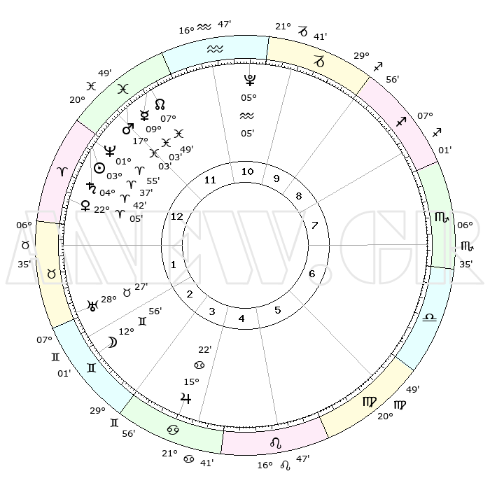 | | ΘΕΣΕΙΣ ΠΛΑΝΗΤΩΝ ΑΣΤΡΟΛΟΓΙΚΟΥ ΧΑΡΤΗ ΤΗΣ ΣΤΙΓΜΗΣ ΑΥΤΗΣ | | | | Πλανήτης | Ζώδιο | Μοίρες | Δεκαήμ. | Σε οίκο | Απόκλιση | | Ακμές των οίκων | | Ηλιος | Κριός | 03°33' | Πρώτο | 12 | 01 N 25 | | 1ος | 05°07' | Κριός | | Σελήνη | Δίδυμοι | 12°08' | Δεύτερο | 3 | 27 N 25 | | 2ος | 14°08' | Ταύρος | | Ερμής | Ιχθείς | 09°02' | Πρώτο | 12 | 08 S 00 | | 3ος | 10°46' | Δίδυμοι | | Αφροδίτη | Κριός | 22°01' | Τρίτο | 1 | 07 N 53 | | 4ος | 02°52' | Καρκίνος | | Αρης | Ιχθείς | 17°00' | Δεύτερο | 12 | 06 S 07 | | 5ος | 25°25' | Καρκίνος | | Δίας | Καρκίνος | 15°22' | Δεύτερο | 4 | 22 N 55 | | 6ος | 23°38' | Λέων | | Κρόνος | Κριός | 04°41' | Πρώτο | 12 | 00 S 05 | | 7ος | 05°07' | Ζυγός | | Ουρανός | Ταύρος | 28°27' | Τρίτο | 2 | 19 N 38 | | 8ος | 14°08' | Σκορπιός | | Ποσειδώνας | Κριός | 01°55' | Πρώτο | 12 | 00 S 26 | | 9ος | 10°46' | Τοξότης | | Πλούτωνας | Υδροχόος | 05°05' | Πρώτο | 11 | 22 S 48 | | 10ος | 02°52' | Αιγόκερως | | Β. Δεσμός | Ιχθείς | 07°49' | Πρώτο | 12 | 08 S 38 | | 11ος | 25°25' | Αιγόκερως | | Ωροσκόπος | Κριός | 05°07' | Πρώτο | | | 12ος | 23°38' | Υδροχόος | | Μεσουράνημα | Αιγόκερως | 02°52' | Πρώτο | | | |