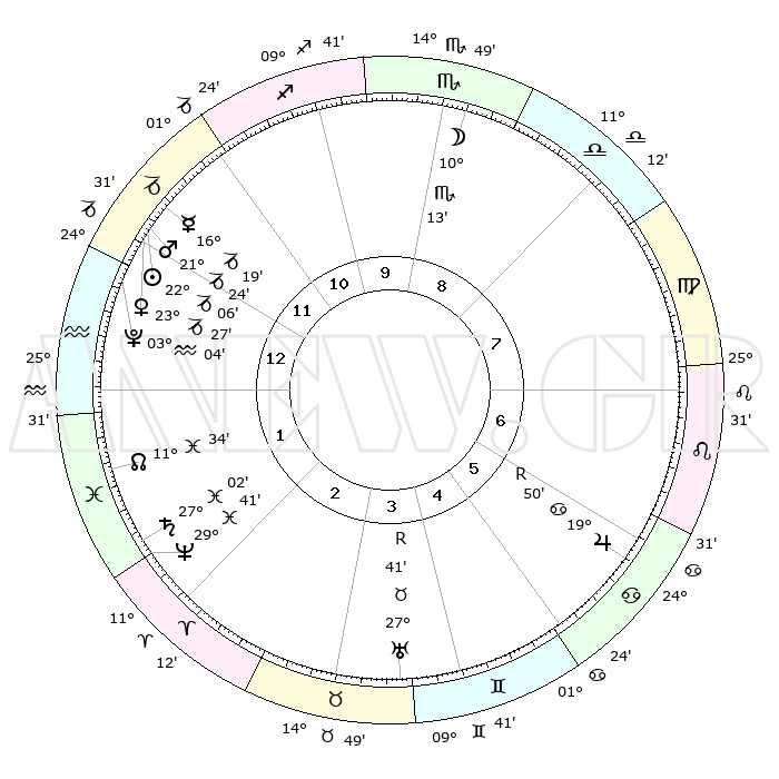 | | ΘΕΣΕΙΣ ΠΛΑΝΗΤΩΝ ΑΣΤΡΟΛΟΓΙΚΟΥ ΧΑΡΤΗ ΤΗΣ ΣΤΙΓΜΗΣ ΑΥΤΗΣ | | | | Πλανήτης | Ζώδιο | Μοίρες | Δεκαήμ. | Σε οίκο | Απόκλιση | | Ακμές των οίκων | | Ηλιος | Αιγόκερως | 22°02' | Τρίτο | 12 | 21 S 38 | | 1ος | 26°57' | Αιγόκερως | | Σελήνη | Σκορπιός | 09°30' | Πρώτο | 9 | 18 S 49 | | 2ος | 10°31' | Ιχθείς | | Ερμής | Αιγόκερως | 16°13' | Δεύτερο | 12 | 24 S 03 | | 3ος | 19°25' | Κριός | | Αφροδίτη | Αιγόκερως | 23°22' | Τρίτο | 12 | 22 S 18 | | 4ος | 18°25' | Ταύρος | | Αρης | Αιγόκερως | 21°22' | Τρίτο | 12 | 22 S 41 | | 5ος | 11°25' | Δίδυμοι | | Δίας | Καρκίνος | 19°51'R | Δεύτερο | 6 | 22 N 14 | | 6ος | 02°45' | Καρκίνος | | Κρόνος | Ιχθείς | 27°02' | Τρίτο | 2 | 03 S 13 | | 7ος | 26°57' | Καρκίνος | | Ουρανός | Ταύρος | 27°41'R | Τρίτο | 4 | 19 N 27 | | 8ος | 10°31' | Παρθένος | | Ποσειδώνας | Ιχθείς | 29°41' | Τρίτο | 2 | 01 S 21 | | 9ος | 19°25' | Ζυγός | | Πλούτωνας | Υδροχόος | 03°04' | Πρώτο | 1 | 23 S 09 | | 10ος | 18°25' | Σκορπιός | | Β. Δεσμός | Ιχθείς | 11°34' | Δεύτερο | 2 | 07 S 13 | | 11ος | 11°25' | Τοξότης | | Ωροσκόπος | Αιγόκερως | 26°57' | Τρίτο | | | 12ος | 02°45' | Αιγόκερως | | Μεσουράνημα | Σκορπιός | 18°25' | Δεύτερο | | | |