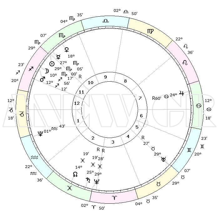 | | ΘΕΣΕΙΣ ΠΛΑΝΗΤΩΝ ΑΣΤΡΟΛΟΓΙΚΟΥ ΧΑΡΤΗ ΤΗΣ ΣΤΙΓΜΗΣ ΑΥΤΗΣ | | | | Πλανήτης | Ζώδιο | Μοίρες | Δεκαήμ. | Σε οίκο | Απόκλιση | | Ακμές των οίκων | | Ηλιος | Σκορπιός | 29°15' | Τρίτο | 11 | 19 S 59 | | 1ος | 01°39' | Αιγόκερως | | Σελήνη | Τοξότης | 10°34' | Δεύτερο | 11 | 26 S 58 | | 2ος | 09°14' | Υδροχόος | | Ερμής | Σκορπιός | 27°03'R | Τρίτο | 11 | 18 S 40 | | 3ος | 19°20' | Ιχθείς | | Αφροδίτη | Σκορπιός | 18°03' | Δεύτερο | 10 | 16 S 13 | | 4ος | 23°00' | Κριός | | Αρης | Τοξότης | 12°10' | Δεύτερο | 12 | 22 S 49 | | 5ος | 19°03' | Ταύρος | | Δίας | Καρκίνος | 24°60'R | Τρίτο | 7 | 21 N 16 | | 6ος | 10°45' | Δίδυμοι | | Κρόνος | Ιχθείς | 25°19'R | Τρίτο | 3 | 04 S 04 | | 7ος | 01°39' | Καρκίνος | | Ουρανός | Ταύρος | 29°27'R | Τρίτο | 5 | 19 N 50 | | 8ος | 09°13' | Λέων | | Ποσειδώνας | Ιχθείς | 29°28'R | Τρίτο | 3 | 01 S 27 | | 9ος | 19°20' | Παρθένος | | Πλούτωνας | Υδροχόος | 01°43' | Πρώτο | 1 | 23 S 27 | | 10ος | 23°00' | Ζυγός | | Β. Δεσμός | Ιχθείς | 14°19' | Δεύτερο | 2 | 06 S 10 | | 11ος | 19°03' | Σκορπιός | | Ωροσκόπος | Αιγόκερως | 01°39' | Πρώτο | | | 12ος | 10°45' | Τοξότης | | Μεσουράνημα | Ζυγός | 23°00' | Τρίτο | | | |