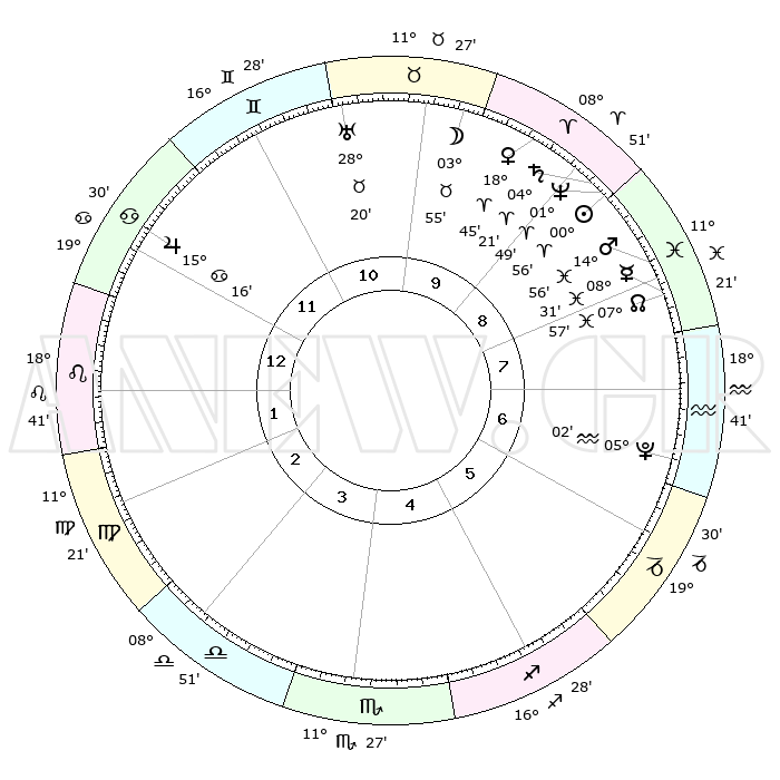 | | ΘΕΣΕΙΣ ΠΛΑΝΗΤΩΝ ΑΣΤΡΟΛΟΓΙΚΟΥ ΧΑΡΤΗ ΤΗΣ ΣΤΙΓΜΗΣ ΑΥΤΗΣ | | | | Πλανήτης | Ζώδιο | Μοίρες | Δεκαήμ. | Σε οίκο | Απόκλιση | | Ακμές των οίκων | | Ηλιος | Κριός | 00°52' | Πρώτο | 9 | 00 N 21 | | 1ος | 29°44' | Καρκίνος | | Σελήνη | Ταύρος | 02°58' | Πρώτο | 10 | 16 N 29 | | 2ος | 20°46' | Λέων | | Ερμής | Ιχθείς | 08°31' | Πρώτο | 8 | 07 S 37 | | 3ος | 15°46' | Παρθένος | | Αφροδίτη | Κριός | 18°40' | Δεύτερο | 10 | 06 N 32 | | 4ος | 16°47' | Ζυγός | | Αρης | Ιχθείς | 14°53' | Δεύτερο | 8 | 06 S 57 | | 5ος | 22°50' | Σκορπιός | | Δίας | Καρκίνος | 15°16' | Δεύτερο | 12 | 22 N 55 | | 6ος | 28°34' | Τοξότης | | Κρόνος | Κριός | 04°21' | Πρώτο | 9 | 00 S 13 | | 7ος | 29°44' | Αιγόκερως | | Ουρανός | Ταύρος | 28°20' | Τρίτο | 11 | 19 N 37 | | 8ος | 20°46' | Υδροχόος | | Ποσειδώνας | Κριός | 01°49' | Πρώτο | 9 | 00 S 29 | | 9ος | 15°46' | Ιχθείς | | Πλούτωνας | Υδροχόος | 05°01' | Πρώτο | 7 | 22 S 48 | | 10ος | 16°47' | Κριός | | Β. Δεσμός | Ιχθείς | 07°58' | Πρώτο | 8 | 08 S 35 | | 11ος | 22°50' | Ταύρος | | Ωροσκόπος | Καρκίνος | 29°44' | Τρίτο | | | 12ος | 28°35' | Δίδυμοι | | Μεσουράνημα | Κριός | 16°47' | Δεύτερο | | | |