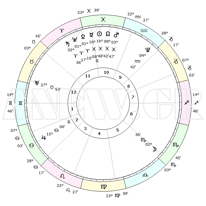 | | ΘΕΣΕΙΣ ΠΛΑΝΗΤΩΝ ΑΣΤΡΟΛΟΓΙΚΟΥ ΧΑΡΤΗ ΤΗΣ ΣΤΙΓΜΗΣ ΑΥΤΗΣ | | | | Πλανήτης | Ζώδιο | Μοίρες | Δεκαήμ. | Σε οίκο | Απόκλιση | | Ακμές των οίκων | | Ηλιος | Ιχθείς | 16°45' | Δεύτερο | 11 | 05 S 14 | | 1ος | 22°48' | Ταύρος | | Σελήνη | Σκορπιός | 01°56' | Πρώτο | 6 | 16 S 06 | | 2ος | 19°10' | Δίδυμοι | | Ερμής | Ιχθείς | 17°01'R | Δεύτερο | 11 | 01 S 46 | | 3ος | 10°54' | Καρκίνος | | Αφροδίτη | Κριός | 01°06' | Πρώτο | 11 | 00 S 42 | | 4ος | 03°13' | Λέων | | Αρης | Ιχθείς | 03°44' | Πρώτο | 11 | 11 S 09 | | 5ος | 00°30' | Παρθένος | | Δίας | Καρκίνος | 15°07'R | Δεύτερο | 3 | 22 N 56 | | 6ος | 07°43' | Ζυγός | | Κρόνος | Κριός | 02°36' | Πρώτο | 11 | 00 S 55 | | 7ος | 22°48' | Σκορπιός | | Ουρανός | Ταύρος | 27°53' | Τρίτο | 1 | 19 N 31 | | 8ος | 19°10' | Τοξότης | | Ποσειδώνας | Κριός | 01°17' | Πρώτο | 11 | 00 S 41 | | 9ος | 10°54' | Αιγόκερως | | Πλούτωνας | Υδροχόος | 04°42' | Πρώτο | 10 | 22 S 51 | | 10ος | 03°13' | Υδροχόος | | Β. Δεσμός | Ιχθείς | 08°43' | Πρώτο | 11 | 08 S 18 | | 11ος | 00°30' | Ιχθείς | | Ωροσκόπος | Ταύρος | 22°48' | Τρίτο | | | 12ος | 07°43' | Κριός | | Μεσουράνημα | Υδροχόος | 03°13' | Πρώτο | | | |