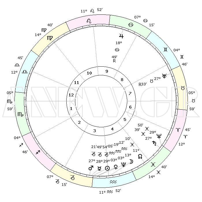 | | ΘΕΣΕΙΣ ΠΛΑΝΗΤΩΝ ΑΣΤΡΟΛΟΓΙΚΟΥ ΧΑΡΤΗ ΤΗΣ ΣΤΙΓΜΗΣ ΑΥΤΗΣ | | | | Πλανήτης | Ζώδιο | Μοίρες | Δεκαήμ. | Σε οίκο | Απόκλιση | | Ακμές των οίκων | | Ηλιος | Αιγόκερως | 29°49' | Τρίτο | 4 | 20 S 11 | | 1ος | 09°47' | Ζυγός | | Σελήνη | Υδροχόος | 12°04' | Δεύτερο | 4 | 19 S 27 | | 2ος | 07°02' | Σκορπιός | | Ερμής | Αιγόκερως | 28°40' | Τρίτο | 4 | 22 S 23 | | 3ος | 07°51' | Τοξότης | | Αφροδίτη | Υδροχόος | 02°58' | Πρώτο | 4 | 20 S 34 | | 4ος | 11°01' | Αιγόκερως | | Αρης | Αιγόκερως | 27°17' | Τρίτο | 4 | 21 S 40 | | 5ος | 13°57' | Υδροχόος | | Δίας | Καρκίνος | 18°50'R | Δεύτερο | 10 | 22 N 23 | | 6ος | 13°59' | Ιχθείς | | Κρόνος | Ιχθείς | 27°39' | Τρίτο | 6 | 02 S 58 | | 7ος | 09°47' | Κριός | | Ουρανός | Ταύρος | 27°33'R | Τρίτο | 8 | 19 N 25 | | 8ος | 07°02' | Ταύρος | | Ποσειδώνας | Ιχθείς | 29°50' | Τρίτο | 6 | 01 S 17 | | 9ος | 07°51' | Δίδυμοι | | Πλούτωνας | Υδροχόος | 03°19' | Πρώτο | 4 | 23 S 06 | | 10ος | 11°01' | Καρκίνος | | Β. Δεσμός | Ιχθείς | 11°10' | Δεύτερο | 5 | 07 S 23 | | 11ος | 13°57' | Λέων | | Ωροσκόπος | Ζυγός | 09°47' | Πρώτο | | | 12ος | 13°59' | Παρθένος | | Μεσουράνημα | Καρκίνος | 11°01' | Δεύτερο | | | |