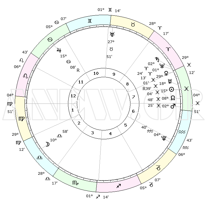 | | ΘΕΣΕΙΣ ΠΛΑΝΗΤΩΝ ΑΣΤΡΟΛΟΓΙΚΟΥ ΧΑΡΤΗ ΤΗΣ ΣΤΙΓΜΗΣ ΑΥΤΗΣ | | | | Πλανήτης | Ζώδιο | Μοίρες | Δεκαήμ. | Σε οίκο | Απόκλιση | | Ακμές των οίκων | | Ηλιος | Ιχθείς | 15°00' | Δεύτερο | 8 | 05 S 54 | | 1ος | 16°54' | Λέων | | Σελήνη | Ζυγός | 10°11' | Δεύτερο | 3 | 06 S 33 | | 2ος | 09°23' | Παρθένος | | Ερμής | Ιχθείς | 18°42'R | Δεύτερο | 8 | 01 S 04 | | 3ος | 06°39' | Ζυγός | | Αφροδίτη | Ιχθείς | 28°56' | Τρίτο | 8 | 01 S 36 | | 4ος | 09°11' | Σκορπιός | | Αρης | Ιχθείς | 02°22' | Πρώτο | 7 | 11 S 39 | | 5ος | 14°19' | Τοξότης | | Δίας | Καρκίνος | 15°08'R | Δεύτερο | 11 | 22 N 55 | | 6ος | 17°34' | Αιγόκερως | | Κρόνος | Κριός | 02°23' | Πρώτο | 8 | 01 S 00 | | 7ος | 16°54' | Υδροχόος | | Ουρανός | Ταύρος | 27°50' | Τρίτο | 10 | 19 N 30 | | 8ος | 09°23' | Ιχθείς | | Ποσειδώνας | Κριός | 01°13' | Πρώτο | 8 | 00 S 43 | | 9ος | 06°39' | Κριός | | Πλούτωνας | Υδροχόος | 04°39' | Πρώτο | 6 | 22 S 51 | | 10ος | 09°11' | Ταύρος | | Β. Δεσμός | Ιχθείς | 08°48' | Πρώτο | 7 | 08 S 16 | | 11ος | 14°19' | Δίδυμοι | | Ωροσκόπος | Λέων | 16°54' | Δεύτερο | | | 12ος | 17°35' | Καρκίνος | | Μεσουράνημα | Ταύρος | 09°11' | Πρώτο | | | |