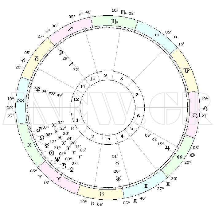 | | ΘΕΣΕΙΣ ΠΛΑΝΗΤΩΝ ΑΣΤΡΟΛΟΓΙΚΟΥ ΧΑΡΤΗ ΤΗΣ ΣΤΙΓΜΗΣ ΑΥΤΗΣ | | | | Πλανήτης | Ζώδιο | Μοίρες | Δεκαήμ. | Σε οίκο | Απόκλιση | | Ακμές των οίκων | | Ηλιος | Ιχθείς | 21°30' | Τρίτο | 2 | 03 S 22 | | 1ος | 19°43' | Αιγόκερως | | Σελήνη | Τοξότης | 28°49' | Τρίτο | 12 | 28 S 23 | | 2ος | 01°47' | Ιχθείς | | Ερμής | Ιχθείς | 12°24'R | Δεύτερο | 2 | 04 S 06 | | 3ος | 11°33' | Κριός | | Αφροδίτη | Κριός | 07°00' | Πρώτο | 2 | 01 N 45 | | 4ος | 11°53' | Ταύρος | | Αρης | Ιχθείς | 07°29' | Πρώτο | 2 | 09 S 46 | | 5ος | 05°33' | Δίδυμοι | | Δίας | Καρκίνος | 15°05' | Δεύτερο | 6 | 22 N 56 | | 6ος | 26°46' | Δίδυμοι | | Κρόνος | Κριός | 03°11' | Πρώτο | 2 | 00 S 41 | | 7ος | 19°43' | Καρκίνος | | Ουρανός | Ταύρος | 28°01' | Τρίτο | 4 | 19 N 33 | | 8ος | 01°47' | Παρθένος | | Ποσειδώνας | Κριός | 01°27' | Πρώτο | 2 | 00 S 37 | | 9ος | 11°33' | Ζυγός | | Πλούτωνας | Υδροχόος | 04°49' | Πρώτο | 1 | 22 S 50 | | 10ος | 11°53' | Σκορπιός | | Β. Δεσμός | Ιχθείς | 08°28' | Πρώτο | 2 | 08 S 24 | | 11ος | 05°33' | Τοξότης | | Ωροσκόπος | Αιγόκερως | 19°43' | Δεύτερο | | | 12ος | 26°46' | Τοξότης | | Μεσουράνημα | Σκορπιός | 11°53' | Δεύτερο | | | |