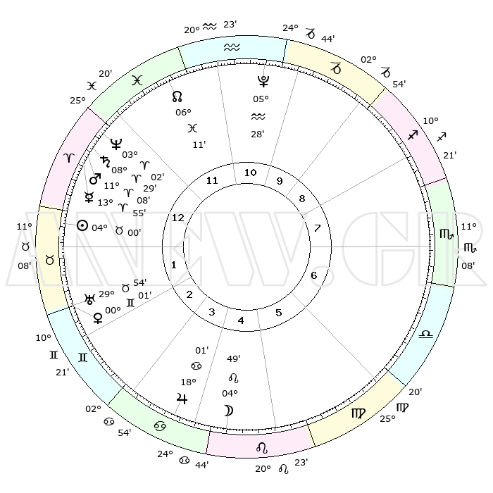 | | ΘΕΣΕΙΣ ΠΛΑΝΗΤΩΝ ΑΣΤΡΟΛΟΓΙΚΟΥ ΧΑΡΤΗ ΤΗΣ ΣΤΙΓΜΗΣ ΑΥΤΗΣ | | | | Πλανήτης | Ζώδιο | Μοίρες | Δεκαήμ. | Σε οίκο | Απόκλιση | | Ακμές των οίκων | | Ηλιος | Ταύρος | 03°53' | Πρώτο | 2 | 12 N 49 | | 1ος | 29°57' | Υδροχόος | | Σελήνη | Λέων | 03°04' | Πρώτο | 6 | 22 N 16 | | 2ος | 15°23' | Κριός | | Ερμής | Κριός | 13°42' | Δεύτερο | 1 | 03 N 07 | | 3ος | 18°06' | Ταύρος | | Αφροδίτη | Ταύρος | 29°51' | Τρίτο | 3 | 20 N 41 | | 4ος | 12°30' | Δίδυμοι | | Αρης | Κριός | 11°02' | Δεύτερο | 1 | 03 N 30 | | 5ος | 04°12' | Καρκίνος | | Δίας | Καρκίνος | 17°60' | Δεύτερο | 5 | 22 N 36 | | 6ος | 27°45' | Καρκίνος | | Κρόνος | Κριός | 08°28' | Πρώτο | 1 | 01 N 22 | | 7ος | 29°57' | Λέων | | Ουρανός | Ταύρος | 29°54' | Τρίτο | 3 | 19 N 58 | | 8ος | 15°23' | Ζυγός | | Ποσειδώνας | Κριός | 03°02' | Πρώτο | 1 | 00 S 00 | | 9ος | 18°06' | Σκορπιός | | Πλούτωνας | Υδροχόος | 05°28' | Πρώτο | 12 | 22 S 48 | | 10ος | 12°30' | Τοξότης | | Β. Δεσμός | Ιχθείς | 06°11' | Πρώτο | 1 | 09 S 14 | | 11ος | 04°12' | Αιγόκερως | | Ωροσκόπος | Υδροχόος | 29°57' | Τρίτο | | | 12ος | 27°45' | Αιγόκερως | | Μεσουράνημα | Τοξότης | 12°30' | Δεύτερο | | | |
