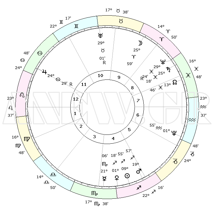 | | ΘΕΣΕΙΣ ΠΛΑΝΗΤΩΝ ΑΣΤΡΟΛΟΓΙΚΟΥ ΧΑΡΤΗ ΤΗΣ ΣΤΙΓΜΗΣ ΑΥΤΗΣ | | | | Πλανήτης | Ζώδιο | Μοίρες | Δεκαήμ. | Σε οίκο | Απόκλιση | | Ακμές των οίκων | | Ηλιος | Τοξότης | 09°53' | Πρώτο | 4 | 21 S 56 | | 1ος | 13°46' | Λέων | | Σελήνη | Κριός | 25°29' | Τρίτο | 9 | 12 N 56 | | 2ος | 05°57' | Παρθένος | | Ερμής | Σκορπιός | 21°05' | Τρίτο | 4 | 15 S 30 | | 3ος | 02°50' | Ζυγός | | Αφροδίτη | Τοξότης | 01°15' | Πρώτο | 4 | 19 S 45 | | 4ος | 05°10' | Σκορπιός | | Αρης | Τοξότης | 19°55' | Δεύτερο | 5 | 23 S 43 | | 5ος | 10°32' | Τοξότης | | Δίας | Καρκίνος | 24°29'R | Τρίτο | 12 | 21 N 23 | | 6ος | 14°10' | Αιγόκερως | | Κρόνος | Ιχθείς | 25°18' | Τρίτο | 8 | 04 S 03 | | 7ος | 13°46' | Υδροχόος | | Ουρανός | Ταύρος | 29°01'R | Τρίτο | 10 | 19 N 44 | | 8ος | 05°57' | Ιχθείς | | Ποσειδώνας | Ιχθείς | 29°24'R | Τρίτο | 8 | 01 S 29 | | 9ος | 02°50' | Κριός | | Πλούτωνας | Υδροχόος | 01°55' | Πρώτο | 6 | 23 S 24 | | 10ος | 05°10' | Ταύρος | | Β. Δεσμός | Ιχθείς | 13°46' | Δεύτερο | 8 | 06 S 23 | | 11ος | 10°32' | Δίδυμοι | | Ωροσκόπος | Λέων | 13°46' | Δεύτερο | | | 12ος | 14°10' | Καρκίνος | | Μεσουράνημα | Ταύρος | 05°10' | Πρώτο | | | |