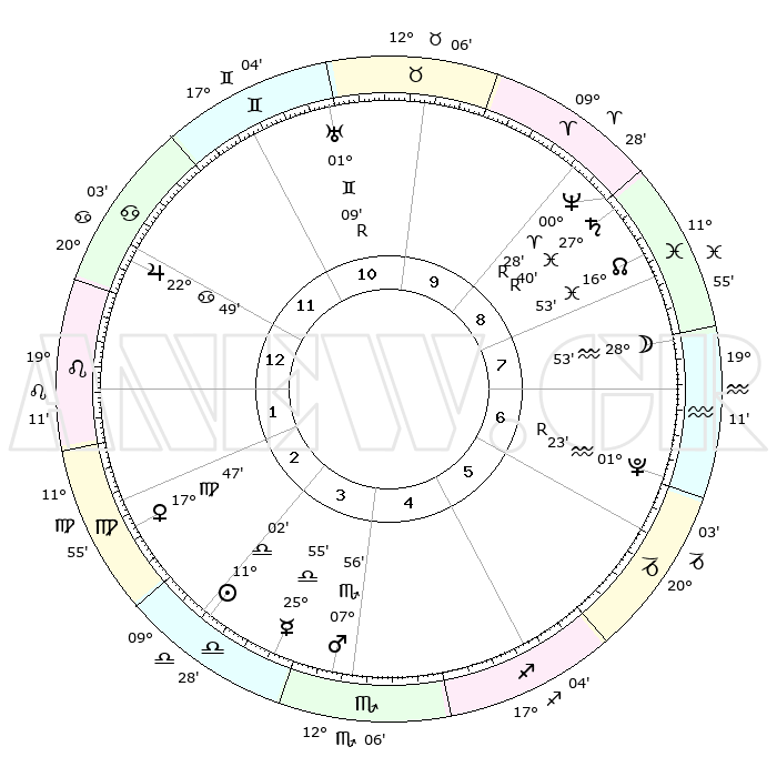 | ΘΕΣΕΙΣ ΠΛΑΝΗΤΩΝ ΑΣΤΡΟΛΟΓΙΚΟΥ ΧΑΡΤΗ ΤΗΣ ΣΤΙΓΜΗΣ ΑΥΤΗΣ | | Πλανήτης | Ζώδιο | Μοίρες | Δεκαήμ. | Σε οίκο | Απόκλιση | | Ακμές των οίκων | Ηλιος | Ζυγός | 10°58' | Δεύτερο | 3 | 04 S 20 | | 1ος | 28°38' | Καρκίνος | Σελήνη | Υδροχόος | 27°55' | Τρίτο | 8 | 13 S 54 | | 2ος | 19°34' | Λέων | Ερμής | Ζυγός | 25°48' | Τρίτο | 4 | 10 S 23 | | 3ος | 14°26' | Παρθένος | Αφροδίτη | Παρθένος | 17°42' | Δεύτερο | 3 | 06 N 06 | | 4ος | 15°18' | Ζυγός | Αρης | Σκορπιός | 07°53' | Πρώτο | 4 | 14 S 14 | | 5ος | 21°22' | Σκορπιός | Δίας | Καρκίνος | 22°49' | Τρίτο | 12 | 21 N 32 | | 6ος | 27°18' | Τοξότης | Κρόνος | Ιχθείς | 27°40'R | Τρίτο | 9 | 03 S 14 | | 7ος | 28°38' | Αιγόκερως | Ουρανός | Δίδυμοι | 01°09'R | Πρώτο | 11 | 20 N 11 | | 8ος | 19°34' | Υδροχόος | Ποσειδώνας | Κριός | 00°28'R | Πρώτο | 9 | 01 S 05 | | 9ος | 14°26' | Ιχθείς | Πλούτωνας | Υδροχόος | 01°23'R | Πρώτο | 7 | 23 S 32 | | 10ος | 15°18' | Κριός | Β. Δεσμός | Ιχθείς | 16°53' | Δεύτερο | 9 | 05 S 11 | | 11ος | 21°22' | Ταύρος | Ωροσκόπος | Καρκίνος | 28°38' | Τρίτο | | | 12ος | 27°18' | Δίδυμοι | Μεσουράνημα | Κριός | 15°18' | Δεύτερο | | | |