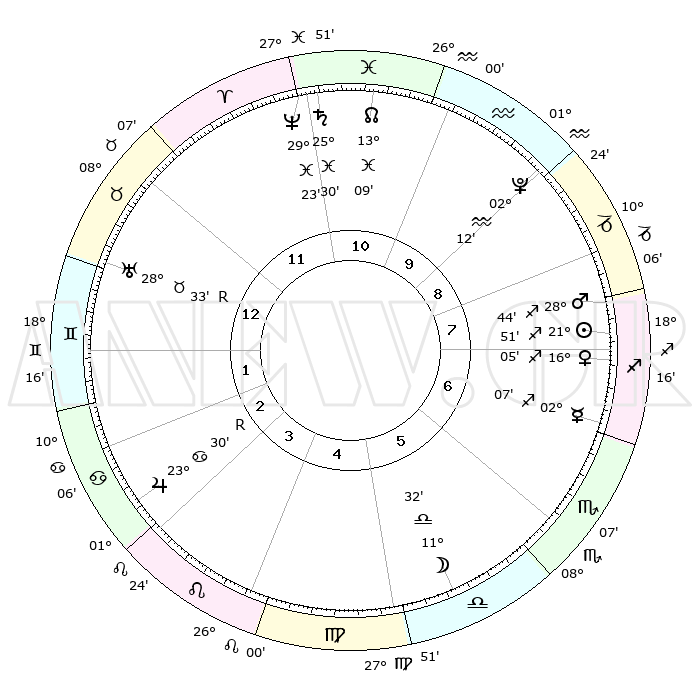 | | ΘΕΣΕΙΣ ΠΛΑΝΗΤΩΝ ΑΣΤΡΟΛΟΓΙΚΟΥ ΧΑΡΤΗ ΤΗΣ ΣΤΙΓΜΗΣ ΑΥΤΗΣ | | | | Πλανήτης | Ζώδιο | Μοίρες | Δεκαήμ. | Σε οίκο | Απόκλιση | | Ακμές των οίκων | | Ηλιος | Τοξότης | 21°03' | Τρίτο | 4 | 23 S 08 | | 1ος | 25°16' | Λέων | | Σελήνη | Ζυγός | 02°04' | Πρώτο | 2 | 02 S 20 | | 2ος | 18°38' | Παρθένος | | Ερμής | Τοξότης | 01°07' | Πρώτο | 4 | 18 S 37 | | 3ος | 16°51' | Ζυγός | | Αφροδίτη | Τοξότης | 15°06' | Δεύτερο | 4 | 22 S 21 | | 4ος | 19°41' | Σκορπιός | | Αρης | Τοξότης | 28°09' | Τρίτο | 5 | 24 S 11 | | 5ος | 24°12' | Τοξότης | | Δίας | Καρκίνος | 23°35'R | Τρίτο | 11 | 21 N 34 | | 6ος | 26°34' | Αιγόκερως | | Κρόνος | Ιχθείς | 25°28' | Τρίτο | 8 | 03 S 56 | | 7ος | 25°16' | Υδροχόος | | Ουρανός | Ταύρος | 28°35'R | Τρίτο | 10 | 19 N 38 | | 8ος | 18°38' | Ιχθείς | | Ποσειδώνας | Ιχθείς | 29°22' | Τρίτο | 8 | 01 S 29 | | 9ος | 16°51' | Κριός | | Πλούτωνας | Υδροχόος | 02°11' | Πρώτο | 6 | 23 S 20 | | 10ος | 19°41' | Ταύρος | | Β. Δεσμός | Ιχθείς | 13°11' | Δεύτερο | 7 | 06 S 36 | | 11ος | 24°12' | Δίδυμοι | | Ωροσκόπος | Λέων | 25°16' | Τρίτο | | | 12ος | 26°34' | Καρκίνος | | Μεσουράνημα | Ταύρος | 19°41' | Δεύτερο | | | |