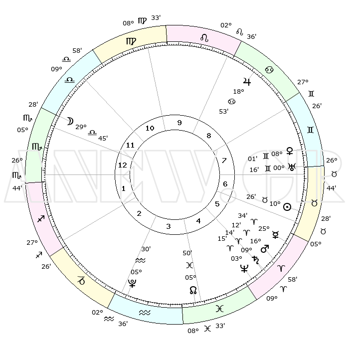 | | ΘΕΣΕΙΣ ΠΛΑΝΗΤΩΝ ΑΣΤΡΟΛΟΓΙΚΟΥ ΧΑΡΤΗ ΤΗΣ ΣΤΙΓΜΗΣ ΑΥΤΗΣ | | | | Πλανήτης | Ζώδιο | Μοίρες | Δεκαήμ. | Σε οίκο | Απόκλιση | | Ακμές των οίκων | | Ηλιος | Ταύρος | 10°23' | Δεύτερο | 6 | 14 N 56 | | 1ος | 12°26' | Σκορπιός | | Σελήνη | Ζυγός | 29°09' | Τρίτο | 12 | 14 S 54 | | 2ος | 11°42' | Τοξότης | | Ερμής | Κριός | 25°28' | Τρίτο | 6 | 08 N 02 | | 3ος | 14°53' | Αιγόκερως | | Αφροδίτη | Δίδυμοι | 07°58' | Πρώτο | 7 | 22 N 30 | | 4ος | 19°58' | Υδροχόος | | Αρης | Κριός | 16°10' | Δεύτερο | 5 | 05 N 32 | | 5ος | 22°32' | Ιχθείς | | Δίας | Καρκίνος | 18°53' | Δεύτερο | 9 | 22 N 29 | | 6ος | 19°53' | Κριός | | Κρόνος | Κριός | 09°14' | Πρώτο | 5 | 01 N 40 | | 7ος | 12°26' | Ταύρος | | Ουρανός | Δίδυμοι | 00°16' | Πρώτο | 7 | 20 N 02 | | 8ος | 11°42' | Δίδυμοι | | Ποσειδώνας | Κριός | 03°15' | Πρώτο | 5 | 00 N 05 | | 9ος | 14°53' | Καρκίνος | | Πλούτωνας | Υδροχόος | 05°30' | Πρώτο | 3 | 22 S 49 | | 10ος | 19°58' | Λέων | | Β. Δεσμός | Ιχθείς | 05°50' | Πρώτο | 4 | 09 S 22 | | 11ος | 22°32' | Παρθένος | | Ωροσκόπος | Σκορπιός | 12°26' | Δεύτερο | | | 12ος | 19°53' | Ζυγός | | Μεσουράνημα | Λέων | 19°58' | Δεύτερο | | | |