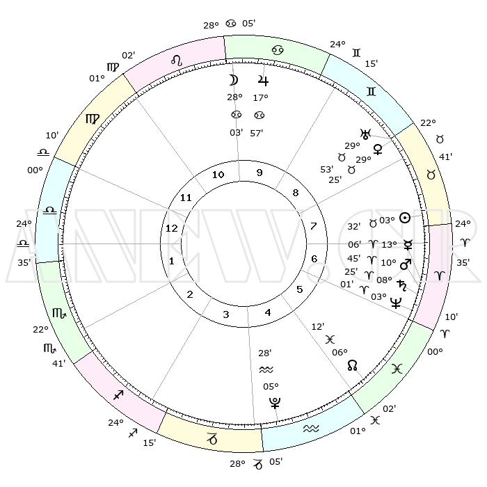 | | ΘΕΣΕΙΣ ΠΛΑΝΗΤΩΝ ΑΣΤΡΟΛΟΓΙΚΟΥ ΧΑΡΤΗ ΤΗΣ ΣΤΙΓΜΗΣ ΑΥΤΗΣ | | | | Πλανήτης | Ζώδιο | Μοίρες | Δεκαήμ. | Σε οίκο | Απόκλιση | | Ακμές των οίκων | | Ηλιος | Ταύρος | 03°29' | Πρώτο | 7 | 12 N 40 | | 1ος | 08°04' | Ζυγός | | Σελήνη | Καρκίνος | 27°16' | Τρίτο | 10 | 23 N 56 | | 2ος | 05°12' | Σκορπιός | | Ερμής | Κριός | 13°00' | Δεύτερο | 7 | 02 N 49 | | 3ος | 05°57' | Τοξότης | | Αφροδίτη | Ταύρος | 29°21' | Τρίτο | 8 | 20 N 34 | | 4ος | 09°05' | Αιγόκερως | | Αρης | Κριός | 10°43' | Δεύτερο | 7 | 03 N 23 | | 5ος | 12°01' | Υδροχόος | | Δίας | Καρκίνος | 17°57' | Δεύτερο | 10 | 22 N 37 | | 6ος | 12°07' | Ιχθείς | | Κρόνος | Κριός | 08°25' | Πρώτο | 7 | 01 N 21 | | 7ος | 08°04' | Κριός | | Ουρανός | Ταύρος | 29°52' | Τρίτο | 8 | 19 N 57 | | 8ος | 05°12' | Ταύρος | | Ποσειδώνας | Κριός | 03°01' | Πρώτο | 6 | 00 S 00 | | 9ος | 05°57' | Δίδυμοι | | Πλούτωνας | Υδροχόος | 05°28' | Πρώτο | 4 | 22 S 48 | | 10ος | 09°05' | Καρκίνος | | Β. Δεσμός | Ιχθείς | 06°12' | Πρώτο | 5 | 09 S 14 | | 11ος | 12°01' | Λέων | | Ωροσκόπος | Ζυγός | 08°04' | Πρώτο | | | 12ος | 12°07' | Παρθένος | | Μεσουράνημα | Καρκίνος | 09°05' | Πρώτο | | | |