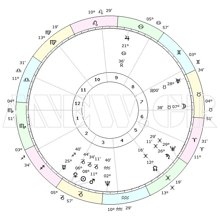 | | ΘΕΣΕΙΣ ΠΛΑΝΗΤΩΝ ΑΣΤΡΟΛΟΓΙΚΟΥ ΧΑΡΤΗ ΤΗΣ ΣΤΙΓΜΗΣ ΑΥΤΗΣ | | | | Πλανήτης | Ζώδιο | Μοίρες | Δεκαήμ. | Σε οίκο | Απόκλιση | | Ακμές των οίκων | | Ηλιος | Αιγόκερως | 08°29' | Πρώτο | 3 | 23 S 10 | | 1ος | 12°32' | Ζυγός | | Σελήνη | Ταύρος | 06°32' | Πρώτο | 7 | 17 N 38 | | 2ος | 09°57' | Σκορπιός | | Ερμής | Τοξότης | 25°33' | Τρίτο | 3 | 23 S 42 | | 3ος | 10°52' | Τοξότης | | Αφροδίτη | Αιγόκερως | 06°39' | Πρώτο | 3 | 23 S 42 | | 4ος | 14°08' | Αιγόκερως | | Αρης | Αιγόκερως | 11°08' | Δεύτερο | 3 | 23 S 50 | | 5ος | 17°04' | Υδροχόος | | Δίας | Καρκίνος | 21°37'R | Τρίτο | 10 | 21 N 56 | | 6ος | 16°58' | Ιχθείς | | Κρόνος | Ιχθείς | 26°10' | Τρίτο | 6 | 03 S 36 | | 7ος | 12°32' | Κριός | | Ουρανός | Ταύρος | 28°00'R | Τρίτο | 8 | 19 N 31 | | 8ος | 09°57' | Ταύρος | | Ποσειδώνας | Ιχθείς | 29°29' | Τρίτο | 6 | 01 S 26 | | 9ος | 10°52' | Δίδυμοι | | Πλούτωνας | Υδροχόος | 02°40' | Πρώτο | 4 | 23 S 14 | | 10ος | 14°08' | Καρκίνος | | Β. Δεσμός | Ιχθείς | 12°17' | Δεύτερο | 5 | 06 S 57 | | 11ος | 17°04' | Λέων | | Ωροσκόπος | Ζυγός | 12°32' | Δεύτερο | | | 12ος | 16°58' | Παρθένος | | Μεσουράνημα | Καρκίνος | 14°08' | Δεύτερο | | | |