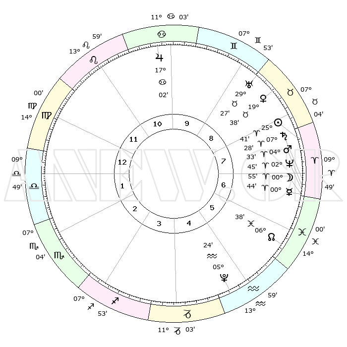 | | ΘΕΣΕΙΣ ΠΛΑΝΗΤΩΝ ΑΣΤΡΟΛΟΓΙΚΟΥ ΧΑΡΤΗ ΤΗΣ ΣΤΙΓΜΗΣ ΑΥΤΗΣ | | | | Πλανήτης | Ζώδιο | Μοίρες | Δεκαήμ. | Σε οίκο | Απόκλιση | | Ακμές των οίκων | | Ηλιος | Κριός | 24°53' | Τρίτο | 5 | 09 N 38 | | 1ος | 01°25' | Τοξότης | | Σελήνη | Ιχθείς | 19°31' | Δεύτερο | 4 | 03 S 13 | | 2ος | 02°45' | Αιγόκερως | | Ερμής | Ιχθείς | 29°35' | Τρίτο | 4 | 02 S 32 | | 3ος | 08°41' | Υδροχόος | | Αφροδίτη | Ταύρος | 18°37' | Δεύτερο | 6 | 17 N 31 | | 4ος | 14°45' | Ιχθείς | | Αρης | Κριός | 03°55' | Πρώτο | 4 | 00 N 39 | | 5ος | 15°37' | Κριός | | Δίας | Καρκίνος | 16°57' | Δεύτερο | 8 | 22 N 44 | | 6ος | 10°28' | Ταύρος | | Κρόνος | Κριός | 07°22' | Πρώτο | 4 | 00 N 57 | | 7ος | 01°25' | Δίδυμοι | | Ουρανός | Ταύρος | 29°25' | Τρίτο | 6 | 19 N 51 | | 8ος | 02°45' | Καρκίνος | | Ποσειδώνας | Κριός | 02°43' | Πρώτο | 4 | 00 S 07 | | 9ος | 08°41' | Λέων | | Πλούτωνας | Υδροχόος | 05°24' | Πρώτο | 2 | 22 S 47 | | 10ος | 14°45' | Παρθένος | | Β. Δεσμός | Ιχθείς | 06°40' | Πρώτο | 3 | 09 S 04 | | 11ος | 15°37' | Ζυγός | | Ωροσκόπος | Τοξότης | 01°25' | Πρώτο | | | 12ος | 10°28' | Σκορπιός | | Μεσουράνημα | Παρθένος | 14°45' | Δεύτερο | | | |