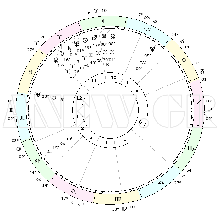 | | ΘΕΣΕΙΣ ΠΛΑΝΗΤΩΝ ΑΣΤΡΟΛΟΓΙΚΟΥ ΧΑΡΤΗ ΤΗΣ ΣΤΙΓΜΗΣ ΑΥΤΗΣ | | | | Πλανήτης | Ζώδιο | Μοίρες | Δεκαήμ. | Σε οίκο | Απόκλιση | | Ακμές των οίκων | | Ηλιος | Ιχθείς | 29°39' | Τρίτο | 12 | 00 S 09 | | 1ος | 03°26' | Ταύρος | | Σελήνη | Κριός | 15°17' | Δεύτερο | 12 | 08 N 54 | | 2ος | 04°42' | Δίδυμοι | | Ερμής | Ιχθείς | 08°30'R | Πρώτο | 11 | 07 S 20 | | 3ος | 27°55' | Δίδυμοι | | Αφροδίτη | Κριός | 17°09' | Δεύτερο | 12 | 05 N 55 | | 4ος | 19°38' | Καρκίνος | | Αρης | Ιχθείς | 13°55' | Δεύτερο | 11 | 07 S 19 | | 5ος | 14°23' | Λέων | | Δίας | Καρκίνος | 15°13' | Δεύτερο | 3 | 22 N 55 | | 6ος | 17°47' | Παρθένος | | Κρόνος | Κριός | 04°12' | Πρώτο | 12 | 00 S 17 | | 7ος | 03°26' | Σκορπιός | | Ουρανός | Ταύρος | 28°18' | Τρίτο | 1 | 19 N 36 | | 8ος | 04°42' | Τοξότης | | Ποσειδώνας | Κριός | 01°46' | Πρώτο | 12 | 00 S 30 | | 9ος | 27°56' | Τοξότης | | Πλούτωνας | Υδροχόος | 05°00' | Πρώτο | 10 | 22 S 49 | | 10ος | 19°38' | Αιγόκερως | | Β. Δεσμός | Ιχθείς | 08°02' | Πρώτο | 11 | 08 S 33 | | 11ος | 14°23' | Υδροχόος | | Ωροσκόπος | Ταύρος | 03°26' | Πρώτο | | | 12ος | 17°47' | Ιχθείς | | Μεσουράνημα | Αιγόκερως | 19°38' | Δεύτερο | | | |