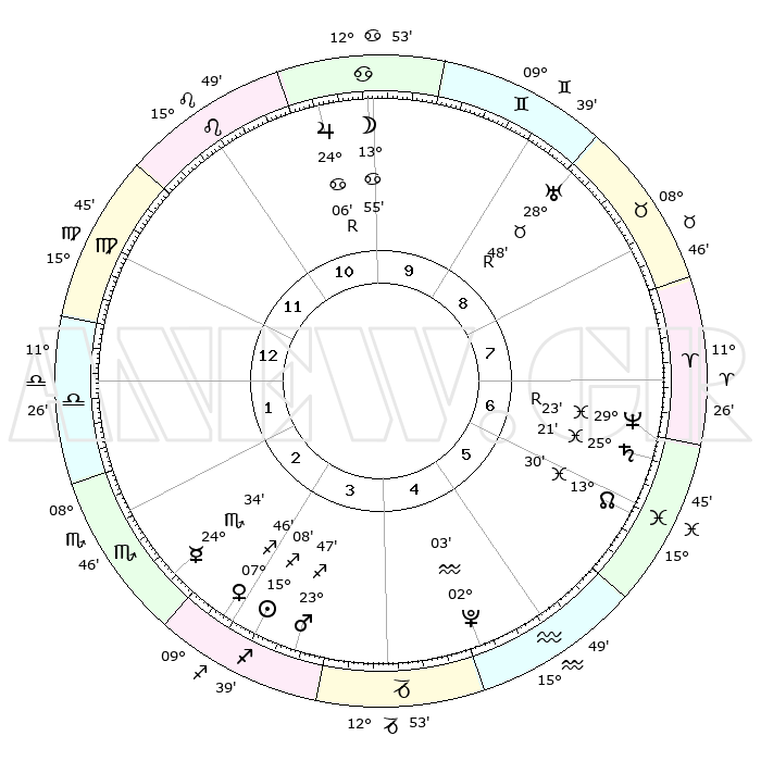 | | ΘΕΣΕΙΣ ΠΛΑΝΗΤΩΝ ΑΣΤΡΟΛΟΓΙΚΟΥ ΧΑΡΤΗ ΤΗΣ ΣΤΙΓΜΗΣ ΑΥΤΗΣ | | | | Πλανήτης | Ζώδιο | Μοίρες | Δεκαήμ. | Σε οίκο | Απόκλιση | | Ακμές των οίκων | | Ηλιος | Τοξότης | 15°06' | Δεύτερο | 3 | 22 S 36 | | 1ος | 28°07' | Παρθένος | | Σελήνη | Καρκίνος | 13°15' | Δεύτερο | 10 | 27 N 06 | | 2ος | 24°34' | Ζυγός | | Ερμής | Σκορπιός | 24°32' | Τρίτο | 2 | 16 S 34 | | 3ος | 24°56' | Σκορπιός | | Αφροδίτη | Τοξότης | 07°43' | Πρώτο | 3 | 21 S 07 | | 4ος | 27°53' | Τοξότης | | Αρης | Τοξότης | 23°45' | Τρίτο | 3 | 24 S 00 | | 5ος | 00°53' | Υδροχόος | | Δίας | Καρκίνος | 24°06'R | Τρίτο | 10 | 21 N 27 | | 6ος | 01°24' | Ιχθείς | | Κρόνος | Ιχθείς | 25°21' | Τρίτο | 6 | 04 S 00 | | 7ος | 28°07' | Ιχθείς | | Ουρανός | Ταύρος | 28°48'R | Τρίτο | 9 | 19 N 41 | | 8ος | 24°34' | Κριός | | Ποσειδώνας | Ιχθείς | 29°23'R | Τρίτο | 7 | 01 S 29 | | 9ος | 24°56' | Ταύρος | | Πλούτωνας | Υδροχόος | 02°02' | Πρώτο | 5 | 23 S 22 | | 10ος | 27°53' | Δίδυμοι | | Β. Δεσμός | Ιχθείς | 13°30' | Δεύτερο | 6 | 06 S 29 | | 11ος | 00°53' | Λέων | | Ωροσκόπος | Παρθένος | 28°07' | Τρίτο | | | 12ος | 01°24' | Παρθένος | | Μεσουράνημα | Δίδυμοι | 27°53' | Τρίτο | | | |