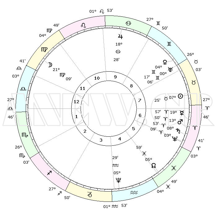 | | ΘΕΣΕΙΣ ΠΛΑΝΗΤΩΝ ΑΣΤΡΟΛΟΓΙΚΟΥ ΧΑΡΤΗ ΤΗΣ ΣΤΙΓΜΗΣ ΑΥΤΗΣ | | | | Πλανήτης | Ζώδιο | Μοίρες | Δεκαήμ. | Σε οίκο | Απόκλιση | | Ακμές των οίκων | | Ηλιος | Ταύρος | 07°22' | Πρώτο | 8 | 13 N 58 | | 1ος | 10°04' | Ζυγός | | Σελήνη | Παρθένος | 20°23' | Τρίτο | 12 | 02 N 45 | | 2ος | 07°19' | Σκορπιός | | Ερμής | Κριός | 19°51' | Δεύτερο | 7 | 05 N 41 | | 3ος | 08°09' | Τοξότης | | Αφροδίτη | Δίδυμοι | 04°12' | Πρώτο | 8 | 21 N 43 | | 4ος | 11°20' | Αιγόκερως | | Αρης | Κριός | 13°47' | Δεύτερο | 7 | 04 N 36 | | 5ος | 14°16' | Υδροχόος | | Δίας | Καρκίνος | 18°27' | Δεύτερο | 10 | 22 N 33 | | 6ος | 14°16' | Ιχθείς | | Κρόνος | Κριός | 08°53' | Πρώτο | 6 | 01 N 32 | | 7ος | 10°04' | Κριός | | Ουρανός | Δίδυμοι | 00°05' | Πρώτο | 8 | 20 N 00 | | 8ος | 07°19' | Ταύρος | | Ποσειδώνας | Κριός | 03°09' | Πρώτο | 6 | 00 N 03 | | 9ος | 08°09' | Δίδυμοι | | Πλούτωνας | Υδροχόος | 05°29' | Πρώτο | 4 | 22 S 48 | | 10ος | 11°20' | Καρκίνος | | Β. Δεσμός | Ιχθείς | 05°60' | Πρώτο | 5 | 09 S 19 | | 11ος | 14°16' | Λέων | | Ωροσκόπος | Ζυγός | 10°04' | Δεύτερο | | | 12ος | 14°16' | Παρθένος | | Μεσουράνημα | Καρκίνος | 11°20' | Δεύτερο | | | |
