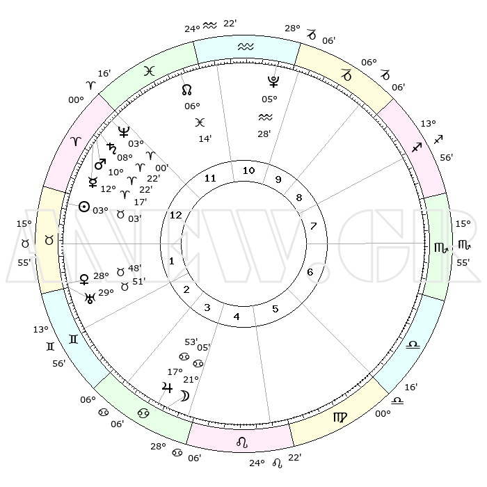 | | ΘΕΣΕΙΣ ΠΛΑΝΗΤΩΝ ΑΣΤΡΟΛΟΓΙΚΟΥ ΧΑΡΤΗ ΤΗΣ ΣΤΙΓΜΗΣ ΑΥΤΗΣ | | | | Πλανήτης | Ζώδιο | Μοίρες | Δεκαήμ. | Σε οίκο | Απόκλιση | | Ακμές των οίκων | | Ηλιος | Ταύρος | 02°54' | Πρώτο | 2 | 12 N 29 | | 1ος | 25°11' | Υδροχόος | | Σελήνη | Καρκίνος | 19°02' | Δεύτερο | 5 | 25 N 52 | | 2ος | 10°54' | Κριός | | Ερμής | Κριός | 12°02' | Δεύτερο | 2 | 02 N 26 | | 3ος | 14°34' | Ταύρος | | Αφροδίτη | Ταύρος | 28°38' | Τρίτο | 3 | 20 N 23 | | 4ος | 09°28' | Δίδυμοι | | Αρης | Κριός | 10°16' | Δεύτερο | 1 | 03 N 12 | | 5ος | 01°12' | Καρκίνος | | Δίας | Καρκίνος | 17°52' | Δεύτερο | 5 | 22 N 37 | | 6ος | 24°17' | Καρκίνος | | Κρόνος | Κριός | 08°21' | Πρώτο | 1 | 01 N 20 | | 7ος | 25°11' | Λέων | | Ουρανός | Ταύρος | 29°51' | Τρίτο | 3 | 19 N 57 | | 8ος | 10°54' | Ζυγός | | Ποσειδώνας | Κριός | 03°00' | Πρώτο | 1 | 00 S 01 | | 9ος | 14°34' | Σκορπιός | | Πλούτωνας | Υδροχόος | 05°28' | Πρώτο | 12 | 22 S 48 | | 10ος | 09°28' | Τοξότης | | Β. Δεσμός | Ιχθείς | 06°14' | Πρώτο | 1 | 09 S 13 | | 11ος | 01°12' | Αιγόκερως | | Ωροσκόπος | Υδροχόος | 25°11' | Τρίτο | | | 12ος | 24°17' | Αιγόκερως | | Μεσουράνημα | Τοξότης | 09°28' | Πρώτο | | | |
