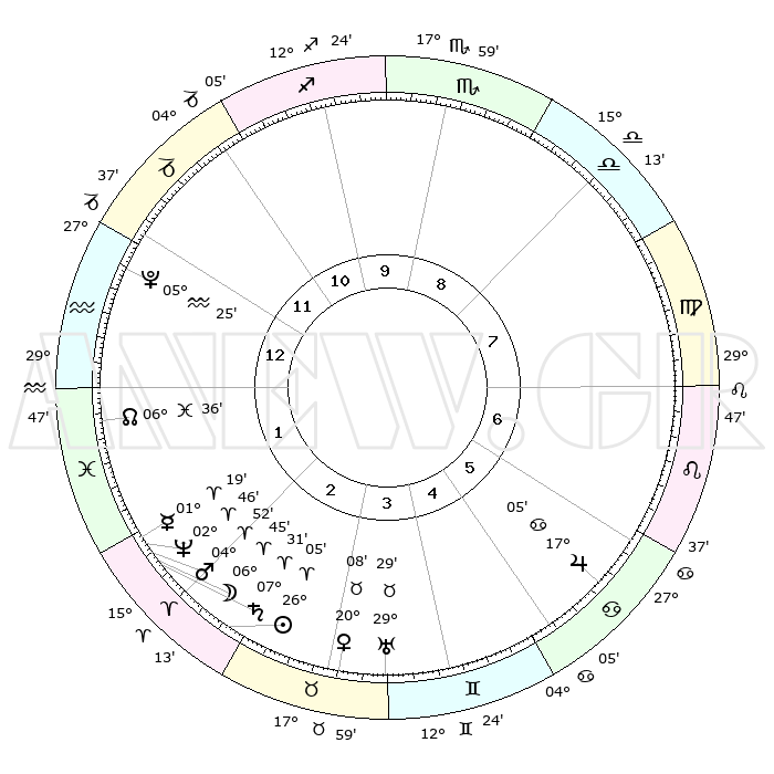 | | ΘΕΣΕΙΣ ΠΛΑΝΗΤΩΝ ΑΣΤΡΟΛΟΓΙΚΟΥ ΧΑΡΤΗ ΤΗΣ ΣΤΙΓΜΗΣ ΑΥΤΗΣ | | | | Πλανήτης | Ζώδιο | Μοίρες | Δεκαήμ. | Σε οίκο | Απόκλιση | | Ακμές των οίκων | | Ηλιος | Κριός | 26°01' | Τρίτο | 3 | 10 N 03 | | 1ος | 27°42' | Αιγόκερως | | Σελήνη | Κριός | 05°48' | Πρώτο | 2 | 04 N 30 | | 2ος | 11°24' | Ιχθείς | | Ερμής | Κριός | 01°13' | Πρώτο | 2 | 01 S 55 | | 3ος | 20°12' | Κριός | | Αφροδίτη | Ταύρος | 20°03' | Τρίτο | 4 | 17 N 57 | | 4ος | 19°04' | Ταύρος | | Αρης | Κριός | 04°49' | Πρώτο | 2 | 01 N 01 | | 5ος | 12°00' | Δίδυμοι | | Δίας | Καρκίνος | 17°04' | Δεύτερο | 6 | 22 N 43 | | 6ος | 03°21' | Καρκίνος | | Κρόνος | Κριός | 07°30' | Πρώτο | 2 | 01 N 00 | | 7ος | 27°42' | Καρκίνος | | Ουρανός | Ταύρος | 29°28' | Τρίτο | 4 | 19 N 52 | | 8ος | 11°24' | Παρθένος | | Ποσειδώνας | Κριός | 02°46' | Πρώτο | 2 | 00 S 06 | | 9ος | 20°12' | Ζυγός | | Πλούτωνας | Υδροχόος | 05°25' | Πρώτο | 1 | 22 S 47 | | 10ος | 19°04' | Σκορπιός | | Β. Δεσμός | Ιχθείς | 06°37' | Πρώτο | 1 | 09 S 05 | | 11ος | 12°00' | Τοξότης | | Ωροσκόπος | Αιγόκερως | 27°42' | Τρίτο | | | 12ος | 03°21' | Αιγόκερως | | Μεσουράνημα | Σκορπιός | 19°04' | Δεύτερο | | | |