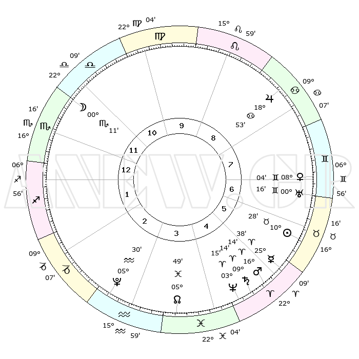 | | ΘΕΣΕΙΣ ΠΛΑΝΗΤΩΝ ΑΣΤΡΟΛΟΓΙΚΟΥ ΧΑΡΤΗ ΤΗΣ ΣΤΙΓΜΗΣ ΑΥΤΗΣ | | | | Πλανήτης | Ζώδιο | Μοίρες | Δεκαήμ. | Σε οίκο | Απόκλιση | | Ακμές των οίκων | | Ηλιος | Ταύρος | 10°25' | Δεύτερο | 6 | 14 N 56 | | 1ος | 21°41' | Σκορπιός | | Σελήνη | Ζυγός | 29°32' | Τρίτο | 11 | 15 S 03 | | 2ος | 21°48' | Τοξότης | | Ερμής | Κριός | 25°32' | Τρίτο | 5 | 08 N 03 | | 3ος | 26°12' | Αιγόκερως | | Αφροδίτη | Δίδυμοι | 08°00' | Πρώτο | 7 | 22 N 31 | | 4ος | 01°54' | Ιχθείς | | Αρης | Κριός | 16°12' | Δεύτερο | 5 | 05 N 33 | | 5ος | 03°50' | Κριός | | Δίας | Καρκίνος | 18°53' | Δεύτερο | 8 | 22 N 29 | | 6ος | 00°00' | Ταύρος | | Κρόνος | Κριός | 09°14' | Πρώτο | 5 | 01 N 40 | | 7ος | 21°41' | Ταύρος | | Ουρανός | Δίδυμοι | 00°16' | Πρώτο | 7 | 20 N 02 | | 8ος | 21°48' | Δίδυμοι | | Ποσειδώνας | Κριός | 03°15' | Πρώτο | 4 | 00 N 05 | | 9ος | 26°12' | Καρκίνος | | Πλούτωνας | Υδροχόος | 05°30' | Πρώτο | 3 | 22 S 49 | | 10ος | 01°54' | Παρθένος | | Β. Δεσμός | Ιχθείς | 05°50' | Πρώτο | 4 | 09 S 22 | | 11ος | 03°50' | Ζυγός | | Ωροσκόπος | Σκορπιός | 21°41' | Τρίτο | | | 12ος | 00°00' | Σκορπιός | | Μεσουράνημα | Παρθένος | 01°54' | Πρώτο | | | |