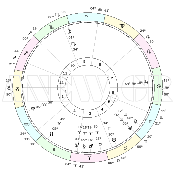 | | ΘΕΣΕΙΣ ΠΛΑΝΗΤΩΝ ΑΣΤΡΟΛΟΓΙΚΟΥ ΧΑΡΤΗ ΤΗΣ ΣΤΙΓΜΗΣ ΑΥΤΗΣ | | | | Πλανήτης | Ζώδιο | Μοίρες | Δεκαήμ. | Σε οίκο | Απόκλιση | | Ακμές των οίκων | | Ηλιος | Ταύρος | 10°32' | Δεύτερο | 4 | 14 N 59 | | 1ος | 00°16' | Αιγόκερως | | Σελήνη | Σκορπιός | 01°06' | Πρώτο | 10 | 15 S 41 | | 2ος | 07°29' | Υδροχόος | | Ερμής | Κριός | 25°46' | Τρίτο | 4 | 08 N 09 | | 3ος | 17°31' | Ιχθείς | | Αφροδίτη | Δίδυμοι | 08°09' | Πρώτο | 5 | 22 N 33 | | 4ος | 21°24' | Κριός | | Αρης | Κριός | 16°17' | Δεύτερο | 3 | 05 N 35 | | 5ος | 17°41' | Ταύρος | | Δίας | Καρκίνος | 18°54' | Δεύτερο | 7 | 22 N 29 | | 6ος | 09°28' | Δίδυμοι | | Κρόνος | Κριός | 09°15' | Πρώτο | 3 | 01 N 40 | | 7ος | 00°16' | Καρκίνος | | Ουρανός | Δίδυμοι | 00°16' | Πρώτο | 5 | 20 N 02 | | 8ος | 07°29' | Λέων | | Ποσειδώνας | Κριός | 03°16' | Πρώτο | 3 | 00 N 05 | | 9ος | 17°31' | Παρθένος | | Πλούτωνας | Υδροχόος | 05°30' | Πρώτο | 1 | 22 S 49 | | 10ος | 21°24' | Ζυγός | | Β. Δεσμός | Ιχθείς | 05°49' | Πρώτο | 2 | 09 S 22 | | 11ος | 17°41' | Σκορπιός | | Ωροσκόπος | Αιγόκερως | 00°16' | Πρώτο | | | 12ος | 09°28' | Τοξότης | | Μεσουράνημα | Ζυγός | 21°24' | Τρίτο | | | |