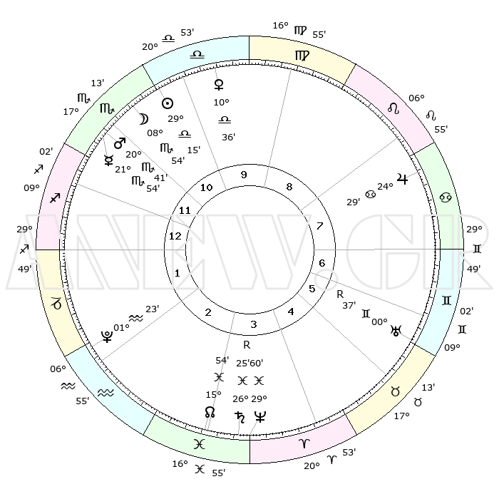 | ΘΕΣΕΙΣ ΠΛΑΝΗΤΩΝ ΑΣΤΡΟΛΟΓΙΚΟΥ ΧΑΡΤΗ ΤΗΣ ΣΤΙΓΜΗΣ ΑΥΤΗΣ | | Πλανήτης | Ζώδιο | Μοίρες | Δεκαήμ. | Σε οίκο | Απόκλιση | | Ακμές των οίκων | Ηλιος | Ζυγός | 28°53' | Τρίτο | 2 | 11 S 04 | | 1ος | 10°47' | Παρθένος | Σελήνη | Σκορπιός | 04°31' | Πρώτο | 2 | 16 S 33 | | 2ος | 05°44' | Ζυγός | Ερμής | Σκορπιός | 21°26' | Τρίτο | 3 | 20 S 26 | | 3ος | 05°14' | Σκορπιός | Αφροδίτη | Ζυγός | 10°08' | Δεύτερο | 2 | 02 S 36 | | 4ος | 08°11' | Τοξότης | Αρης | Σκορπιός | 20°25' | Τρίτο | 3 | 18 S 08 | | 5ος | 11°44' | Αιγόκερως | Δίας | Καρκίνος | 24°28' | Τρίτο | 11 | 21 N 17 | | 6ος | 12°59' | Υδροχόος | Κρόνος | Ιχθείς | 26°27'R | Τρίτο | 7 | 03 S 42 | | 7ος | 10°47' | Ιχθείς | Ουρανός | Δίδυμοι | 00°38'R | Πρώτο | 9 | 20 N 04 | | 8ος | 05°44' | Κριός | Ποσειδώνας | Κριός | 00°00'R | Πρώτο | 7 | 01 S 15 | | 9ος | 05°14' | Ταύρος | Πλούτωνας | Υδροχόος | 01°23' | Πρώτο | 5 | 23 S 32 | | 10ος | 08°11' | Δίδυμοι | Β. Δεσμός | Ιχθείς | 15°56' | Δεύτερο | 7 | 05 S 33 | | 11ος | 11°44' | Καρκίνος | Ωροσκόπος | Παρθένος | 10°47' | Δεύτερο | | | 12ος | 12°59' | Λέων | Μεσουράνημα | Δίδυμοι | 08°11' | Πρώτο | | | |