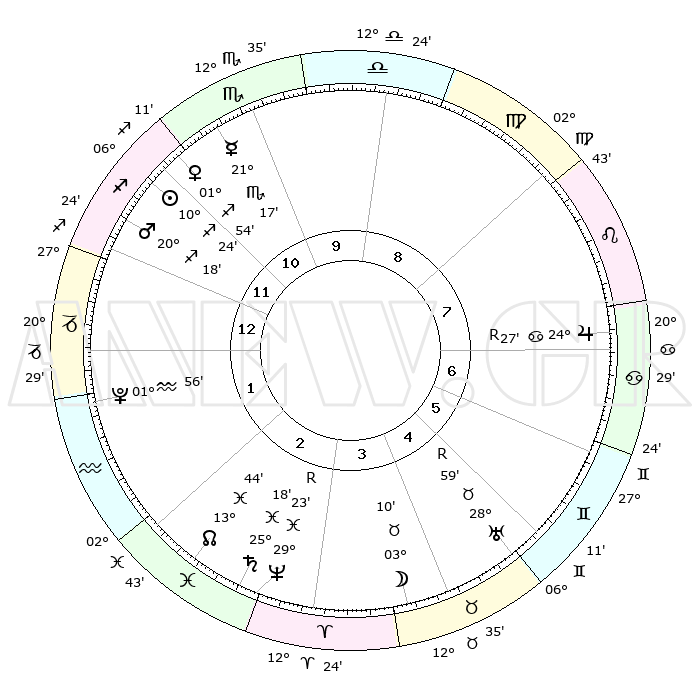 | | ΘΕΣΕΙΣ ΠΛΑΝΗΤΩΝ ΑΣΤΡΟΛΟΓΙΚΟΥ ΧΑΡΤΗ ΤΗΣ ΣΤΙΓΜΗΣ ΑΥΤΗΣ | | | | Πλανήτης | Ζώδιο | Μοίρες | Δεκαήμ. | Σε οίκο | Απόκλιση | | Ακμές των οίκων | | Ηλιος | Τοξότης | 10°22' | Δεύτερο | 11 | 22 S 00 | | 1ος | 05°58' | Αιγόκερως | | Σελήνη | Ταύρος | 02°35' | Πρώτο | 4 | 15 N 53 | | 2ος | 14°39' | Υδροχόος | | Ερμής | Σκορπιός | 21°16' | Τρίτο | 10 | 15 S 33 | | 3ος | 24°55' | Ιχθείς | | Αφροδίτη | Τοξότης | 01°51' | Πρώτο | 11 | 19 S 53 | | 4ος | 27°51' | Κριός | | Αρης | Τοξότης | 20°16' | Τρίτο | 12 | 23 S 45 | | 5ος | 23°15' | Ταύρος | | Δίας | Καρκίνος | 24°27'R | Τρίτο | 7 | 21 N 23 | | 6ος | 14°44' | Δίδυμοι | | Κρόνος | Ιχθείς | 25°18' | Τρίτο | 3 | 04 S 02 | | 7ος | 05°58' | Καρκίνος | | Ουρανός | Ταύρος | 28°60'R | Τρίτο | 5 | 19 N 44 | | 8ος | 14°39' | Λέων | | Ποσειδώνας | Ιχθείς | 29°23'R | Τρίτο | 3 | 01 S 29 | | 9ος | 24°55' | Παρθένος | | Πλούτωνας | Υδροχόος | 01°56' | Πρώτο | 1 | 23 S 24 | | 10ος | 27°51' | Ζυγός | | Β. Δεσμός | Ιχθείς | 13°45' | Δεύτερο | 2 | 06 S 24 | | 11ος | 23°15' | Σκορπιός | | Ωροσκόπος | Αιγόκερως | 05°58' | Πρώτο | | | 12ος | 14°44' | Τοξότης | | Μεσουράνημα | Ζυγός | 27°51' | Τρίτο | | | |