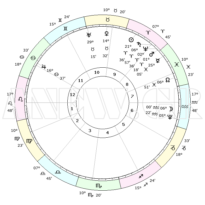 | | ΘΕΣΕΙΣ ΠΛΑΝΗΤΩΝ ΑΣΤΡΟΛΟΓΙΚΟΥ ΧΑΡΤΗ ΤΗΣ ΣΤΙΓΜΗΣ ΑΥΤΗΣ | | | | Πλανήτης | Ζώδιο | Μοίρες | Δεκαήμ. | Σε οίκο | Απόκλιση | | Ακμές των οίκων | | Ηλιος | Κριός | 21°33' | Τρίτο | 10 | 08 N 24 | | 1ος | 01°53' | Λέων | | Σελήνη | Υδροχόος | 05°19' | Πρώτο | 7 | 21 S 39 | | 2ος | 23°03' | Λέων | | Ερμής | Ιχθείς | 25°00' | Τρίτο | 9 | 04 S 13 | | 3ος | 18°21' | Παρθένος | | Αφροδίτη | Ταύρος | 14°28' | Δεύτερο | 10 | 16 N 11 | | 4ος | 19°37' | Ζυγός | | Αρης | Κριός | 01°16' | Πρώτο | 9 | 00 S 25 | | 5ος | 25°37' | Σκορπιός | | Δίας | Καρκίνος | 16°37' | Δεύτερο | 12 | 22 N 46 | | 6ος | 01°00' | Αιγόκερως | | Κρόνος | Κριός | 06°57' | Πρώτο | 9 | 00 N 48 | | 7ος | 01°53' | Υδροχόος | | Ουρανός | Ταύρος | 29°15' | Τρίτο | 11 | 19 N 49 | | 8ος | 23°03' | Υδροχόος | | Ποσειδώνας | Κριός | 02°36' | Πρώτο | 9 | 00 S 10 | | 9ος | 18°21' | Ιχθείς | | Πλούτωνας | Υδροχόος | 05°22' | Πρώτο | 7 | 22 S 47 | | 10ος | 19°37' | Κριός | | Β. Δεσμός | Ιχθείς | 06°51' | Πρώτο | 8 | 09 S 00 | | 11ος | 25°37' | Ταύρος | | Ωροσκόπος | Λέων | 01°53' | Πρώτο | | | 12ος | 01°00' | Καρκίνος | | Μεσουράνημα | Κριός | 19°37' | Δεύτερο | | | |