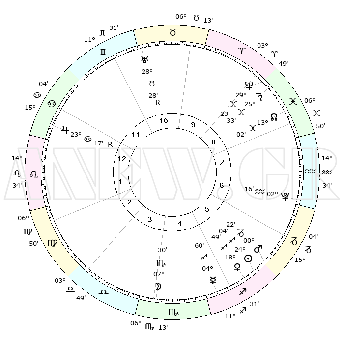 | | ΘΕΣΕΙΣ ΠΛΑΝΗΤΩΝ ΑΣΤΡΟΛΟΓΙΚΟΥ ΧΑΡΤΗ ΤΗΣ ΣΤΙΓΜΗΣ ΑΥΤΗΣ | | | | Πλανήτης | Ζώδιο | Μοίρες | Δεκαήμ. | Σε οίκο | Απόκλιση | | Ακμές των οίκων | | Ηλιος | Τοξότης | 23°01' | Τρίτο | 5 | 23 S 15 | | 1ος | 05°08' | Λέων | | Σελήνη | Ζυγός | 25°16' | Τρίτο | 4 | 12 S 55 | | 2ος | 26°33' | Λέων | | Ερμής | Τοξότης | 03°37' | Πρώτο | 5 | 19 S 20 | | 3ος | 22°17' | Παρθένος | | Αφροδίτη | Τοξότης | 17°31' | Δεύτερο | 5 | 22 S 41 | | 4ος | 23°54' | Ζυγός | | Αρης | Τοξότης | 29°36' | Τρίτο | 5 | 24 S 12 | | 5ος | 29°46' | Σκορπιός | | Δίας | Καρκίνος | 23°23'R | Τρίτο | 12 | 21 N 36 | | 6ος | 04°39' | Αιγόκερως | | Κρόνος | Ιχθείς | 25°32' | Τρίτο | 9 | 03 S 54 | | 7ος | 05°08' | Υδροχόος | | Ουρανός | Ταύρος | 28°30'R | Τρίτο | 10 | 19 N 37 | | 8ος | 26°33' | Υδροχόος | | Ποσειδώνας | Ιχθείς | 29°23' | Τρίτο | 9 | 01 S 29 | | 9ος | 22°17' | Ιχθείς | | Πλούτωνας | Υδροχόος | 02°14' | Πρώτο | 6 | 23 S 20 | | 10ος | 23°54' | Κριός | | Β. Δεσμός | Ιχθείς | 13°05' | Δεύτερο | 8 | 06 S 39 | | 11ος | 29°46' | Ταύρος | | Ωροσκόπος | Λέων | 05°08' | Πρώτο | | | 12ος | 04°39' | Καρκίνος | | Μεσουράνημα | Κριός | 23°54' | Τρίτο | | | |