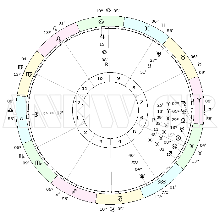 | | ΘΕΣΕΙΣ ΠΛΑΝΗΤΩΝ ΑΣΤΡΟΛΟΓΙΚΟΥ ΧΑΡΤΗ ΤΗΣ ΣΤΙΓΜΗΣ ΑΥΤΗΣ | | | | Πλανήτης | Ζώδιο | Μοίρες | Δεκαήμ. | Σε οίκο | Απόκλιση | | Ακμές των οίκων | | Ηλιος | Ιχθείς | 15°07' | Δεύτερο | 6 | 05 S 52 | | 1ος | 20°19' | Παρθένος | | Σελήνη | Ζυγός | 11°38' | Δεύτερο | 1 | 07 S 14 | | 2ος | 16°09' | Ζυγός | | Ερμής | Ιχθείς | 18°36'R | Δεύτερο | 6 | 01 S 07 | | 3ος | 16°11' | Σκορπιός | | Αφροδίτη | Ιχθείς | 29°04' | Τρίτο | 7 | 01 S 32 | | 4ος | 19°06' | Τοξότης | | Αρης | Ιχθείς | 02°27' | Πρώτο | 6 | 11 S 37 | | 5ος | 22°17' | Αιγόκερως | | Δίας | Καρκίνος | 15°08'R | Δεύτερο | 10 | 22 N 55 | | 6ος | 23°05' | Υδροχόος | | Κρόνος | Κριός | 02°24' | Πρώτο | 7 | 01 S 00 | | 7ος | 20°19' | Ιχθείς | | Ουρανός | Ταύρος | 27°51' | Τρίτο | 9 | 19 N 30 | | 8ος | 16°09' | Κριός | | Ποσειδώνας | Κριός | 01°13' | Πρώτο | 7 | 00 S 43 | | 9ος | 16°11' | Ταύρος | | Πλούτωνας | Υδροχόος | 04°40' | Πρώτο | 5 | 22 S 51 | | 10ος | 19°06' | Δίδυμοι | | Β. Δεσμός | Ιχθείς | 08°48' | Πρώτο | 6 | 08 S 16 | | 11ος | 22°17' | Καρκίνος | | Ωροσκόπος | Παρθένος | 20°19' | Τρίτο | | | 12ος | 23°05' | Λέων | | Μεσουράνημα | Δίδυμοι | 19°06' | Δεύτερο | | | |