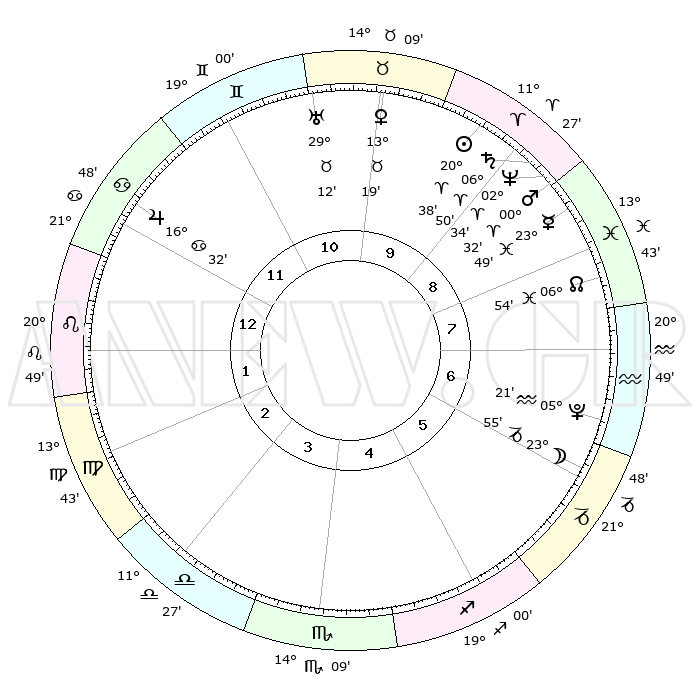 | | ΘΕΣΕΙΣ ΠΛΑΝΗΤΩΝ ΑΣΤΡΟΛΟΓΙΚΟΥ ΧΑΡΤΗ ΤΗΣ ΣΤΙΓΜΗΣ ΑΥΤΗΣ | | | | Πλανήτης | Ζώδιο | Μοίρες | Δεκαήμ. | Σε οίκο | Απόκλιση | | Ακμές των οίκων | | Ηλιος | Κριός | 20°34' | Τρίτο | 10 | 08 N 02 | | 1ος | 29°52' | Καρκίνος | | Σελήνη | Αιγόκερως | 23°02' | Τρίτο | 6 | 25 S 05 | | 2ος | 20°54' | Λέων | | Ερμής | Ιχθείς | 23°44' | Τρίτο | 9 | 04 S 40 | | 3ος | 15°56' | Παρθένος | | Αφροδίτη | Ταύρος | 13°14' | Δεύτερο | 10 | 15 N 46 | | 4ος | 16°57' | Ζυγός | | Αρης | Κριός | 00°29' | Πρώτο | 9 | 00 S 44 | | 5ος | 22°60' | Σκορπιός | | Δίας | Καρκίνος | 16°31' | Δεύτερο | 12 | 22 N 47 | | 6ος | 28°43' | Τοξότης | | Κρόνος | Κριός | 06°50' | Πρώτο | 9 | 00 N 45 | | 7ος | 29°52' | Αιγόκερως | | Ουρανός | Ταύρος | 29°12' | Τρίτο | 11 | 19 N 48 | | 8ος | 20°54' | Υδροχόος | | Ποσειδώνας | Κριός | 02°34' | Πρώτο | 9 | 00 S 11 | | 9ος | 15°56' | Ιχθείς | | Πλούτωνας | Υδροχόος | 05°21' | Πρώτο | 7 | 22 S 47 | | 10ος | 16°57' | Κριός | | Β. Δεσμός | Ιχθείς | 06°54' | Πρώτο | 8 | 08 S 58 | | 11ος | 22°60' | Ταύρος | | Ωροσκόπος | Καρκίνος | 29°52' | Τρίτο | | | 12ος | 28°43' | Δίδυμοι | | Μεσουράνημα | Κριός | 16°57' | Δεύτερο | | | |