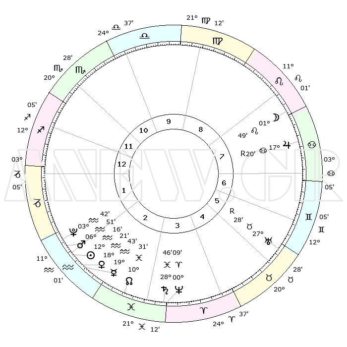 | | ΘΕΣΕΙΣ ΠΛΑΝΗΤΩΝ ΑΣΤΡΟΛΟΓΙΚΟΥ ΧΑΡΤΗ ΤΗΣ ΣΤΙΓΜΗΣ ΑΥΤΗΣ | | | | Πλανήτης | Ζώδιο | Μοίρες | Δεκαήμ. | Σε οίκο | Απόκλιση | | Ακμές των οίκων | | Ηλιος | Υδροχόος | 12°00' | Δεύτερο | 4 | 17 S 11 | | 1ος | 16°34' | Ζυγός | | Σελήνη | Καρκίνος | 28°08' | Τρίτο | 10 | 23 N 53 | | 2ος | 14°13' | Σκορπιός | | Ερμής | Υδροχόος | 19°16' | Δεύτερο | 4 | 16 S 50 | | 3ος | 15°19' | Τοξότης | | Αφροδίτη | Υδροχόος | 18°02' | Δεύτερο | 4 | 16 S 43 | | 4ος | 18°45' | Αιγόκερως | | Αρης | Υδροχόος | 06°38' | Πρώτο | 4 | 19 S 37 | | 5ος | 21°42' | Υδροχόος | | Δίας | Καρκίνος | 17°22'R | Δεύτερο | 9 | 22 N 36 | | 6ος | 21°22' | Ιχθείς | | Κρόνος | Ιχθείς | 28°45' | Τρίτο | 6 | 02 S 30 | | 7ος | 16°34' | Κριός | | Ουρανός | Ταύρος | 27°28'R | Τρίτο | 8 | 19 N 24 | | 8ος | 14°13' | Ταύρος | | Ποσειδώνας | Κριός | 00°08' | Πρώτο | 6 | 01 S 09 | | 9ος | 15°19' | Δίδυμοι | | Πλούτωνας | Υδροχόος | 03°42' | Πρώτο | 4 | 23 S 01 | | 10ος | 18°45' | Καρκίνος | | Β. Δεσμός | Ιχθείς | 10°32' | Δεύτερο | 5 | 07 S 37 | | 11ος | 21°42' | Λέων | | Ωροσκόπος | Ζυγός | 16°34' | Δεύτερο | | | 12ος | 21°22' | Παρθένος | | Μεσουράνημα | Καρκίνος | 18°45' | Δεύτερο | | | |