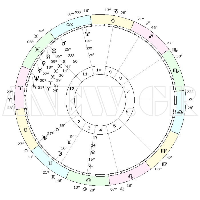 | | ΘΕΣΕΙΣ ΠΛΑΝΗΤΩΝ ΑΣΤΡΟΛΟΓΙΚΟΥ ΧΑΡΤΗ ΤΗΣ ΣΤΙΓΜΗΣ ΑΥΤΗΣ | | | | Πλανήτης | Ζώδιο | Μοίρες | Δεκαήμ. | Σε οίκο | Απόκλιση | | Ακμές των οίκων | | Ηλιος | Ιχθείς | 06°38' | Πρώτο | 12 | 09 S 04 | | 1ος | 21°33' | Ιχθείς | | Σελήνη | Δίδυμοι | 16°07' | Δεύτερο | 3 | 27 N 55 | | 2ος | 03°45' | Ταύρος | | Ερμής | Ιχθείς | 22°28' | Τρίτο | 1 | 00 S 38 | | 3ος | 02°31' | Δίδυμοι | | Αφροδίτη | Ιχθείς | 18°32' | Δεύτερο | 12 | 05 S 50 | | 4ος | 25°15' | Δίδυμοι | | Αρης | Υδροχόος | 25°47' | Τρίτο | 12 | 13 S 57 | | 5ος | 17°14' | Καρκίνος | | Δίας | Καρκίνος | 15°24'R | Δεύτερο | 4 | 22 N 53 | | 6ος | 13°24' | Λέων | | Κρόνος | Κριός | 01°24' | Πρώτο | 1 | 01 S 24 | | 7ος | 21°33' | Παρθένος | | Ουρανός | Ταύρος | 27°39' | Τρίτο | 2 | 19 N 27 | | 8ος | 03°45' | Σκορπιός | | Ποσειδώνας | Κριός | 00°55' | Πρώτο | 1 | 00 S 50 | | 9ος | 02°31' | Τοξότης | | Πλούτωνας | Υδροχόος | 04°26' | Πρώτο | 11 | 22 S 53 | | 10ος | 25°15' | Τοξότης | | Β. Δεσμός | Ιχθείς | 09°15' | Πρώτο | 12 | 08 S 06 | | 11ος | 17°14' | Αιγόκερως | | Ωροσκόπος | Ιχθείς | 21°33' | Τρίτο | | | 12ος | 13°24' | Υδροχόος | | Μεσουράνημα | Τοξότης | 25°15' | Τρίτο | | | |