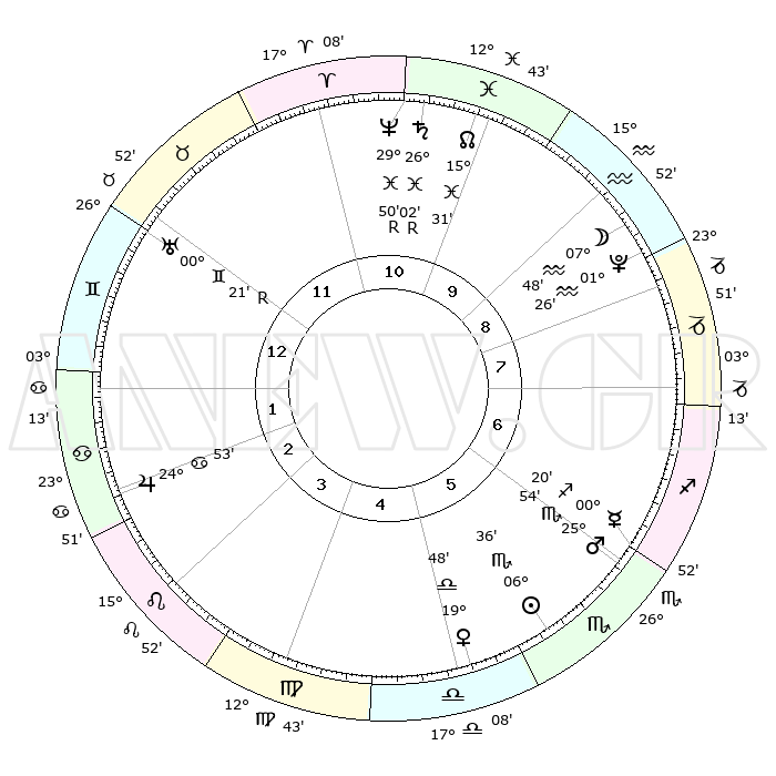 | | ΘΕΣΕΙΣ ΠΛΑΝΗΤΩΝ ΑΣΤΡΟΛΟΓΙΚΟΥ ΧΑΡΤΗ ΤΗΣ ΣΤΙΓΜΗΣ ΑΥΤΗΣ | | | | Πλανήτης | Ζώδιο | Μοίρες | Δεκαήμ. | Σε οίκο | Απόκλιση | | Ακμές των οίκων | | Ηλιος | Σκορπιός | 06°09' | Πρώτο | 11 | 13 S 34 | | 1ος | 13°43' | Τοξότης | | Σελήνη | Υδροχόος | 02°06' | Πρώτο | 2 | 23 S 13 | | 2ος | 17°08' | Αιγόκερως | | Ερμής | Σκορπιός | 29°53' | Τρίτο | 12 | 22 S 54 | | 3ος | 25°08' | Υδροχόος | | Αφροδίτη | Ζυγός | 19°15' | Δεύτερο | 10 | 06 S 08 | | 4ος | 00°57' | Κριός | | Αρης | Σκορπιός | 25°35' | Τρίτο | 12 | 19 S 30 | | 5ος | 29°58' | Κριός | | Δίας | Καρκίνος | 24°52' | Τρίτο | 8 | 21 N 14 | | 6ος | 23°16' | Ταύρος | | Κρόνος | Ιχθείς | 26°03'R | Τρίτο | 3 | 03 S 50 | | 7ος | 13°43' | Δίδυμοι | | Ουρανός | Δίδυμοι | 00°22'R | Πρώτο | 6 | 20 N 01 | | 8ος | 17°08' | Καρκίνος | | Ποσειδώνας | Ιχθείς | 29°51'R | Τρίτο | 3 | 01 S 19 | | 9ος | 25°08' | Λέων | | Πλούτωνας | Υδροχόος | 01°25' | Πρώτο | 2 | 23 S 31 | | 10ος | 00°57' | Ζυγός | | Β. Δεσμός | Ιχθείς | 15°32' | Δεύτερο | 3 | 05 S 42 | | 11ος | 29°58' | Ζυγός | | Ωροσκόπος | Τοξότης | 13°43' | Δεύτερο | | | 12ος | 23°16' | Σκορπιός | | Μεσουράνημα | Ζυγός | 00°57' | Πρώτο | | | |