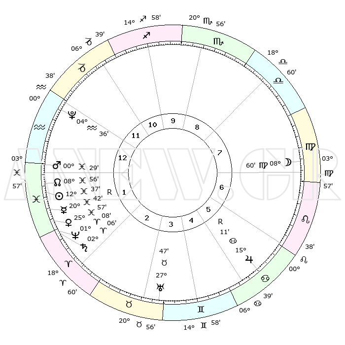 | | ΘΕΣΕΙΣ ΠΛΑΝΗΤΩΝ ΑΣΤΡΟΛΟΓΙΚΟΥ ΧΑΡΤΗ ΤΗΣ ΣΤΙΓΜΗΣ ΑΥΤΗΣ | | | | Πλανήτης | Ζώδιο | Μοίρες | Δεκαήμ. | Σε οίκο | Απόκλιση | | Ακμές των οίκων | | Ηλιος | Ιχθείς | 12°26' | Δεύτερο | 3 | 06 S 54 | | 1ος | 21°45' | Τοξότης | | Σελήνη | Παρθένος | 06°38' | Πρώτο | 9 | 09 N 16 | | 2ος | 26°54' | Αιγόκερως | | Ερμής | Ιχθείς | 20°50'R | Τρίτο | 3 | 00 S 22 | | 3ος | 06°05' | Ιχθείς | | Αφροδίτη | Ιχθείς | 25°44' | Τρίτο | 3 | 02 S 55 | | 4ος | 11°10' | Κριός | | Αρης | Ιχθείς | 00°21' | Πρώτο | 2 | 12 S 22 | | 5ος | 08°50' | Ταύρος | | Δίας | Καρκίνος | 15°12'R | Δεύτερο | 7 | 22 N 55 | | 6ος | 01°17' | Δίδυμοι | | Κρόνος | Κριός | 02°05' | Πρώτο | 3 | 01 S 08 | | 7ος | 21°45' | Δίδυμοι | | Ουρανός | Ταύρος | 27°47' | Τρίτο | 5 | 19 N 29 | | 8ος | 26°54' | Καρκίνος | | Ποσειδώνας | Κριός | 01°07' | Πρώτο | 3 | 00 S 45 | | 9ος | 06°05' | Παρθένος | | Πλούτωνας | Υδροχόος | 04°35' | Πρώτο | 2 | 22 S 52 | | 10ος | 11°10' | Ζυγός | | Β. Δεσμός | Ιχθείς | 08°56' | Πρώτο | 3 | 08 S 13 | | 11ος | 08°50' | Σκορπιός | | Ωροσκόπος | Τοξότης | 21°45' | Τρίτο | | | 12ος | 01°17' | Τοξότης | | Μεσουράνημα | Ζυγός | 11°10' | Δεύτερο | | | |