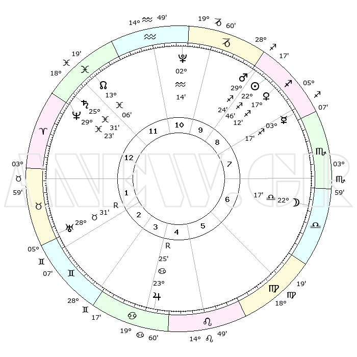 | | ΘΕΣΕΙΣ ΠΛΑΝΗΤΩΝ ΑΣΤΡΟΛΟΓΙΚΟΥ ΧΑΡΤΗ ΤΗΣ ΣΤΙΓΜΗΣ ΑΥΤΗΣ | | | | Πλανήτης | Ζώδιο | Μοίρες | Δεκαήμ. | Σε οίκο | Απόκλιση | | Ακμές των οίκων | | Ηλιος | Τοξότης | 22°30' | Τρίτο | 12 | 23 S 13 | | 1ος | 01°17' | Αιγόκερως | | Σελήνη | Ζυγός | 19°17' | Δεύτερο | 9 | 10 S 18 | | 2ος | 08°46' | Υδροχόος | | Ερμής | Τοξότης | 02°57' | Πρώτο | 11 | 19 S 09 | | 3ος | 18°51' | Ιχθείς | | Αφροδίτη | Τοξότης | 16°53' | Δεύτερο | 12 | 22 S 36 | | 4ος | 22°35' | Κριός | | Αρης | Τοξότης | 29°13' | Τρίτο | 12 | 24 S 12 | | 5ος | 18°42' | Ταύρος | | Δίας | Καρκίνος | 23°26'R | Τρίτο | 7 | 21 N 35 | | 6ος | 10°25' | Δίδυμοι | | Κρόνος | Ιχθείς | 25°31' | Τρίτο | 3 | 03 S 55 | | 7ος | 01°17' | Καρκίνος | | Ουρανός | Ταύρος | 28°31'R | Τρίτο | 5 | 19 N 38 | | 8ος | 08°46' | Λέων | | Ποσειδώνας | Ιχθείς | 29°23' | Τρίτο | 3 | 01 S 29 | | 9ος | 18°51' | Παρθένος | | Πλούτωνας | Υδροχόος | 02°13' | Πρώτο | 1 | 23 S 20 | | 10ος | 22°35' | Ζυγός | | Β. Δεσμός | Ιχθείς | 13°07' | Δεύτερο | 2 | 06 S 38 | | 11ος | 18°42' | Σκορπιός | | Ωροσκόπος | Αιγόκερως | 01°17' | Πρώτο | | | 12ος | 10°25' | Τοξότης | | Μεσουράνημα | Ζυγός | 22°35' | Τρίτο | | | |