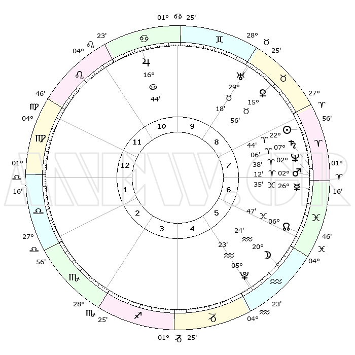 | | ΘΕΣΕΙΣ ΠΛΑΝΗΤΩΝ ΑΣΤΡΟΛΟΓΙΚΟΥ ΧΑΡΤΗ ΤΗΣ ΣΤΙΓΜΗΣ ΑΥΤΗΣ | | | | Πλανήτης | Ζώδιο | Μοίρες | Δεκαήμ. | Σε οίκο | Απόκλιση | | Ακμές των οίκων | | Ηλιος | Κριός | 22°40' | Τρίτο | 8 | 08 N 49 | | 1ος | 12°51' | Παρθένος | | Σελήνη | Υδροχόος | 19°36' | Δεύτερο | 6 | 16 S 30 | | 2ος | 08°00' | Ζυγός | | Ερμής | Ιχθείς | 26°30' | Τρίτο | 7 | 03 S 41 | | 3ος | 07°38' | Σκορπιός | | Αφροδίτη | Ταύρος | 15°51' | Δεύτερο | 9 | 16 N 38 | | 4ος | 10°35' | Τοξότης | | Αρης | Κριός | 02°09' | Πρώτο | 7 | 00 S 03 | | 5ος | 14°02' | Αιγόκερως | | Δίας | Καρκίνος | 16°43' | Δεύτερο | 11 | 22 N 46 | | 6ος | 15°11' | Υδροχόος | | Κρόνος | Κριός | 07°05' | Πρώτο | 7 | 00 N 51 | | 7ος | 12°51' | Ιχθείς | | Ουρανός | Ταύρος | 29°18' | Τρίτο | 9 | 19 N 50 | | 8ος | 08°00' | Κριός | | Ποσειδώνας | Κριός | 02°38' | Πρώτο | 7 | 00 S 09 | | 9ος | 07°38' | Ταύρος | | Πλούτωνας | Υδροχόος | 05°23' | Πρώτο | 5 | 22 S 47 | | 10ος | 10°35' | Δίδυμοι | | Β. Δεσμός | Ιχθείς | 06°47' | Πρώτο | 6 | 09 S 01 | | 11ος | 14°02' | Καρκίνος | | Ωροσκόπος | Παρθένος | 12°51' | Δεύτερο | | | 12ος | 15°11' | Λέων | | Μεσουράνημα | Δίδυμοι | 10°35' | Δεύτερο | | | |