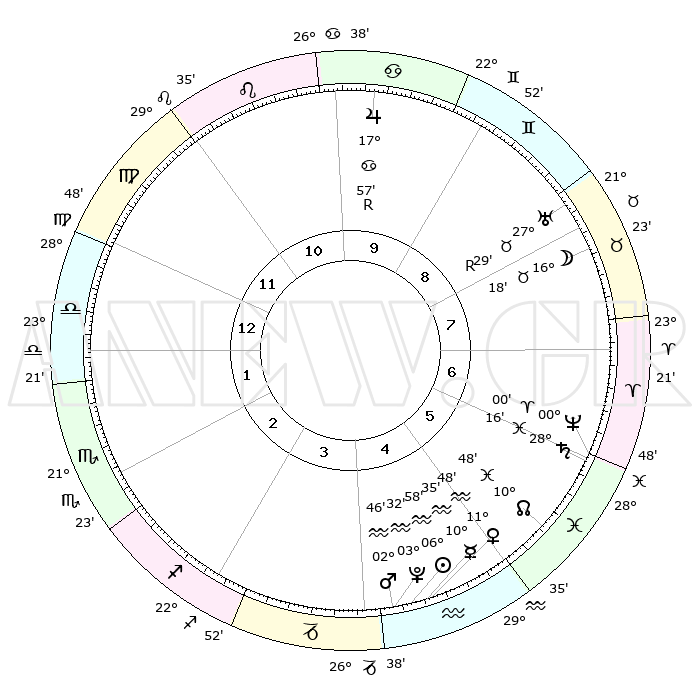 | | ΘΕΣΕΙΣ ΠΛΑΝΗΤΩΝ ΑΣΤΡΟΛΟΓΙΚΟΥ ΧΑΡΤΗ ΤΗΣ ΣΤΙΓΜΗΣ ΑΥΤΗΣ | | | | Πλανήτης | Ζώδιο | Μοίρες | Δεκαήμ. | Σε οίκο | Απόκλιση | | Ακμές των οίκων | | Ηλιος | Υδροχόος | 06°54' | Πρώτο | 4 | 18 S 33 | | 1ος | 04°35' | Ζυγός | | Σελήνη | Ταύρος | 15°24' | Δεύτερο | 8 | 21 N 00 | | 2ος | 01°29' | Σκορπιός | | Ερμής | Υδροχόος | 10°28' | Δεύτερο | 5 | 19 S 36 | | 3ος | 02°05' | Τοξότης | | Αφροδίτη | Υδροχόος | 11°43' | Δεύτερο | 5 | 18 S 29 | | 4ος | 05°08' | Αιγόκερως | | Αρης | Υδροχόος | 02°43' | Πρώτο | 4 | 20 S 33 | | 5ος | 08°05' | Υδροχόος | | Δίας | Καρκίνος | 17°57'R | Δεύτερο | 10 | 22 N 31 | | 6ος | 08°20' | Ιχθείς | | Κρόνος | Ιχθείς | 28°16' | Τρίτο | 6 | 02 S 42 | | 7ος | 04°35' | Κριός | | Ουρανός | Ταύρος | 27°29'R | Τρίτο | 8 | 19 N 24 | | 8ος | 01°29' | Ταύρος | | Ποσειδώνας | Κριός | 00°00'R | Πρώτο | 6 | 01 S 12 | | 9ος | 02°05' | Δίδυμοι | | Πλούτωνας | Υδροχόος | 03°32' | Πρώτο | 4 | 23 S 03 | | 10ος | 05°08' | Καρκίνος | | Β. Δεσμός | Ιχθείς | 10°48' | Δεύτερο | 6 | 07 S 31 | | 11ος | 08°05' | Λέων | | Ωροσκόπος | Ζυγός | 04°35' | Πρώτο | | | 12ος | 08°20' | Παρθένος | | Μεσουράνημα | Καρκίνος | 05°08' | Πρώτο | | | |