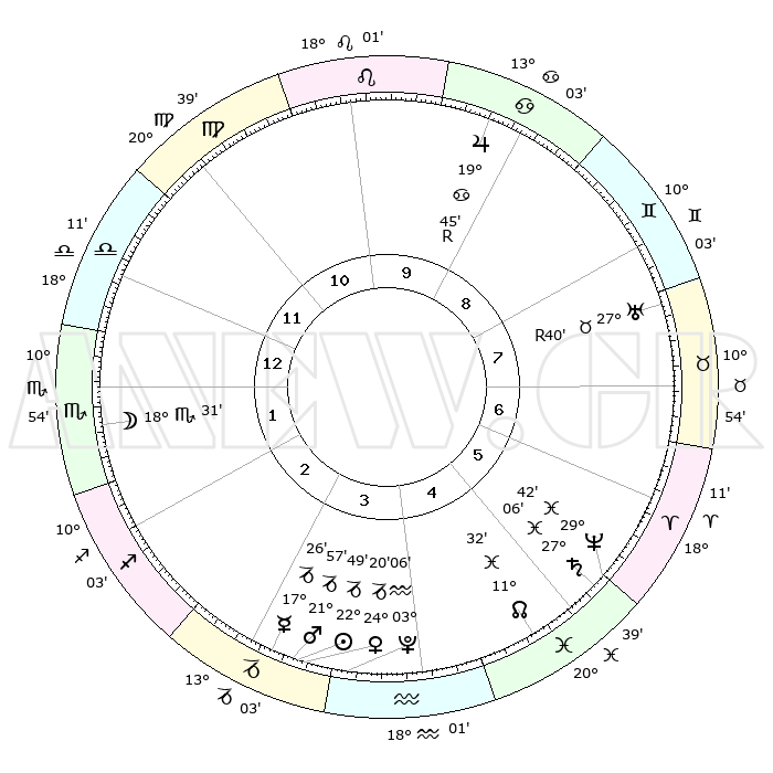 | | ΘΕΣΕΙΣ ΠΛΑΝΗΤΩΝ ΑΣΤΡΟΛΟΓΙΚΟΥ ΧΑΡΤΗ ΤΗΣ ΣΤΙΓΜΗΣ ΑΥΤΗΣ | | | | Πλανήτης | Ζώδιο | Μοίρες | Δεκαήμ. | Σε οίκο | Απόκλιση | | Ακμές των οίκων | | Ηλιος | Αιγόκερως | 22°44' | Τρίτο | 3 | 21 S 31 | | 1ος | 20°18' | Ζυγός | | Σελήνη | Σκορπιός | 17°40' | Δεύτερο | 1 | 21 S 38 | | 2ος | 18°09' | Σκορπιός | | Ερμής | Αιγόκερως | 17°19' | Δεύτερο | 3 | 23 S 57 | | 3ος | 19°27' | Τοξότης | | Αφροδίτη | Αιγόκερως | 24°14' | Τρίτο | 4 | 22 S 10 | | 4ος | 23°04' | Αιγόκερως | | Αρης | Αιγόκερως | 21°54' | Τρίτο | 3 | 22 S 36 | | 5ος | 26°01' | Υδροχόος | | Δίας | Καρκίνος | 19°45'R | Δεύτερο | 9 | 22 N 15 | | 6ος | 25°27' | Ιχθείς | | Κρόνος | Ιχθείς | 27°05' | Τρίτο | 6 | 03 S 12 | | 7ος | 20°18' | Κριός | | Ουρανός | Ταύρος | 27°40'R | Τρίτο | 8 | 19 N 27 | | 8ος | 18°09' | Ταύρος | | Ποσειδώνας | Ιχθείς | 29°42' | Τρίτο | 6 | 01 S 20 | | 9ος | 19°27' | Δίδυμοι | | Πλούτωνας | Υδροχόος | 03°06' | Πρώτο | 4 | 23 S 09 | | 10ος | 23°04' | Καρκίνος | | Β. Δεσμός | Ιχθείς | 11°32' | Δεύτερο | 5 | 07 S 14 | | 11ος | 26°01' | Λέων | | Ωροσκόπος | Ζυγός | 20°18' | Τρίτο | | | 12ος | 25°27' | Παρθένος | | Μεσουράνημα | Καρκίνος | 23°04' | Τρίτο | | | |