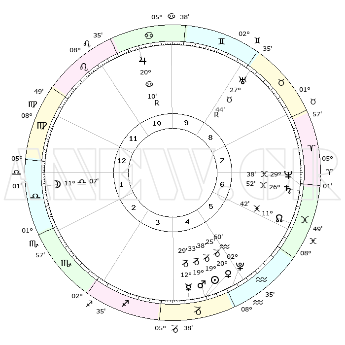 | | ΘΕΣΕΙΣ ΠΛΑΝΗΤΩΝ ΑΣΤΡΟΛΟΓΙΚΟΥ ΧΑΡΤΗ ΤΗΣ ΣΤΙΓΜΗΣ ΑΥΤΗΣ | | | | Πλανήτης | Ζώδιο | Μοίρες | Δεκαήμ. | Σε οίκο | Απόκλιση | | Ακμές των οίκων | | Ηλιος | Αιγόκερως | 18°55' | Δεύτερο | 1 | 22 S 06 | | 1ος | 01°35' | Αιγόκερως | | Σελήνη | Ζυγός | 02°22' | Πρώτο | 9 | 02 S 42 | | 2ος | 09°08' | Υδροχόος | | Ερμής | Αιγόκερως | 11°22' | Δεύτερο | 1 | 24 S 19 | | 3ος | 19°14' | Ιχθείς | | Αφροδίτη | Αιγόκερως | 19°31' | Δεύτερο | 1 | 22 S 48 | | 4ος | 22°55' | Κριός | | Αρης | Αιγόκερως | 18°60' | Δεύτερο | 1 | 23 S 01 | | 5ος | 18°59' | Ταύρος | | Δίας | Καρκίνος | 20°16'R | Τρίτο | 7 | 22 N 10 | | 6ος | 10°41' | Δίδυμοι | | Κρόνος | Ιχθείς | 26°49' | Τρίτο | 3 | 03 S 19 | | 7ος | 01°35' | Καρκίνος | | Ουρανός | Ταύρος | 27°45'R | Τρίτο | 5 | 19 N 28 | | 8ος | 09°08' | Λέων | | Ποσειδώνας | Ιχθείς | 29°38' | Τρίτο | 3 | 01 S 22 | | 9ος | 19°14' | Παρθένος | | Πλούτωνας | Υδροχόος | 02°59' | Πρώτο | 1 | 23 S 10 | | 10ος | 22°55' | Ζυγός | | Β. Δεσμός | Ιχθείς | 11°44' | Δεύτερο | 2 | 07 S 10 | | 11ος | 18°59' | Σκορπιός | | Ωροσκόπος | Αιγόκερως | 01°35' | Πρώτο | | | 12ος | 10°41' | Τοξότης | | Μεσουράνημα | Ζυγός | 22°55' | Τρίτο | | | |